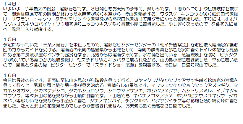 | 15日 | 朝食06:25~尾瀬沼ビジターセンターの朝イチ観察会07:30~08:20~出発08:30 |