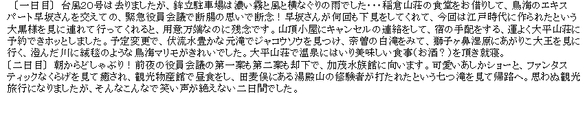 | 8月26日 | 朝食7:00~集合8:00大平山荘出発8:10==加茂水族館9:25~加茂水族館出発10:30==道の駅庄内観光物産館11:00~12:00(昼食・買い物)==田麦俣の七ツ滝12:50==給油=県庁着14:50 |