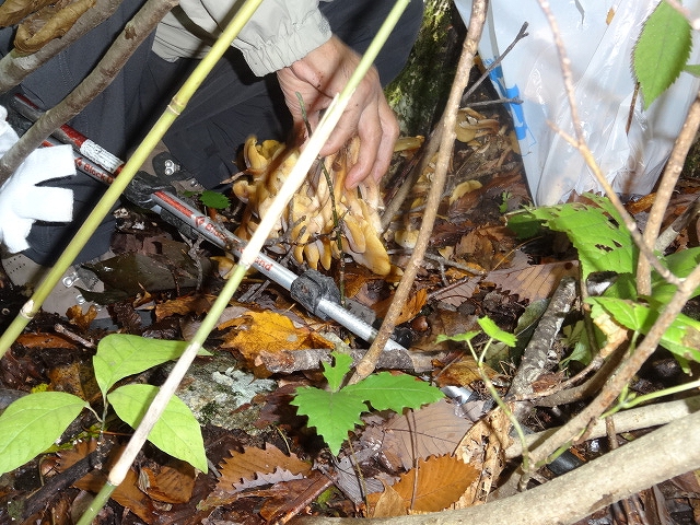 ナラタケやムキタケのキノコが根元や樹木に添って群生