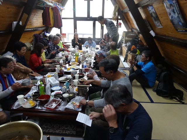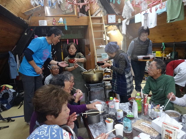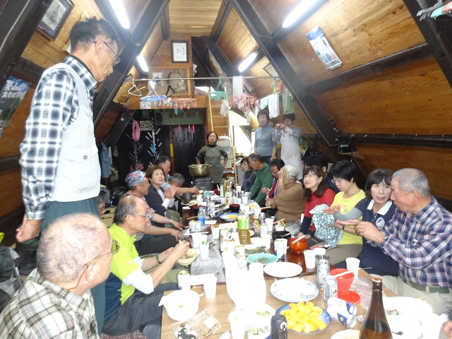 参加者が持ち寄ったワラビの一本漬け、白菜の漬物、栗の渋皮煮、イナゴの佃煮、ワインゼリーなどテーブル一杯に並ぶ