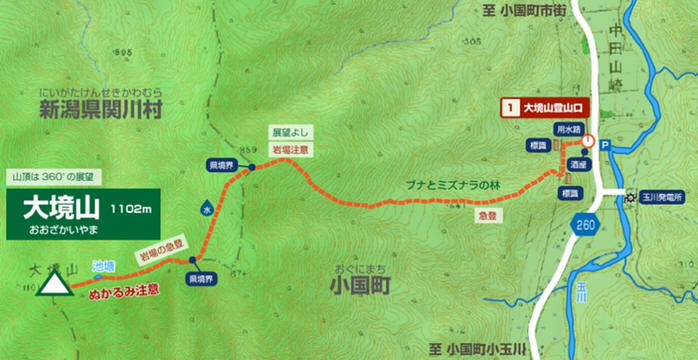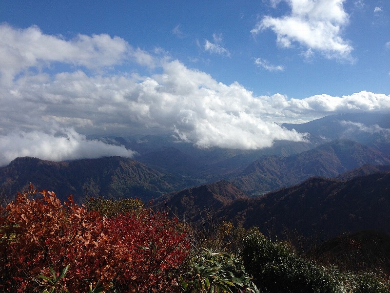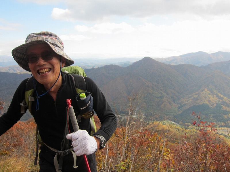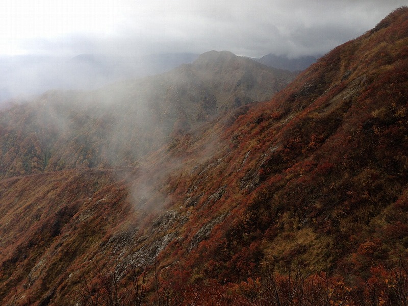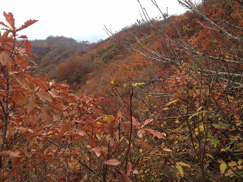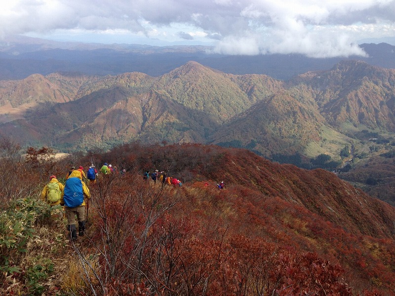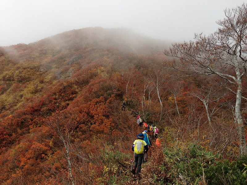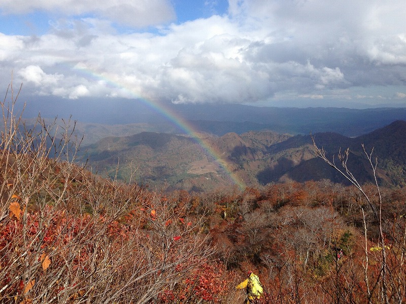 山形県と新潟県の県境に位置する山形百名山に選ばれた大境山。山形県の中でも奥深いところに位置し、新潟百名山にも選ばれているが、登山口は山形県側だけのようである。今回はこのマニアックな山にチャレンジ。 久々の好天での登山ができそうとの期待を胸に出発。飯豊あたりから目指す小国方面に虹のアーチ。美しい虹にみとれていたが、虹が立つということは霧雨?晴への期待がしぼみ始める。徐々に前方は黒雲がかかり、雨も降り始めた。赤芝峡は紅葉真っ盛り、日差しがあれば燃え立つような絶景であろうが。登山口につく頃には小雨程度になり、何とか登れそうだということで出発。中田山崎・舟山酒店脇の用水路の左側を進む。砂防堰堤から左、登山道へ。用水路沿いに進み、2番目の道標から登山道に入る。小沢を渡り湿地を抜け、いよいよ本格的な登山道になる。汗を絞られ、ひたすらあえぎながら登る。落ち葉に覆われた登山道は滑りやすく、下山時が心配になる。時々は日が差し、ブナ・ミズナラ・カエデなどの黄葉・紅葉が青空を背景に輝く瞬間が疲れを癒してくれる。晴れるのは束の間でまた霧雨・雨に変わるので展望がきかない。樹林帯を抜け、足場の悪い急登に手こずり、草木につかまりながら登る。少しなだらかになったあたりが新潟・山形の県境付近の尾根歩き。新潟県側に下りて水場の沢を越えるあたりで、前方に目指す大境山の姿をとらえた。また岩場の急登もあり、手掛かりになるものにつかまりながらよじ登る、緊張の連続。樹林帯から低木に変わり、また樹林帯へ。ようやく最後のやせ尾根の急登に至るが、山形県側は切れ落ちた状態。慎重に歩を進める。偽ピークを過ぎ、池塘の脇を抜け、ようやく山頂に至る。山頂には標識がなく、三角点があるだけの狭い空間。昼食休憩をしているうちに晴れ間が出てきて、雄大な飯豊の姿が見えきたが、山頂は姿を現さなかった。新潟の関川村方面には大石ダムが見えた。 昼食休憩の間に寒くなってきて、早々に切り上げて下山を始める。眼下に紅葉の倉手山や里の絶景が広がっているが、ぬれた急下降ではさらに緊張を強いられ、景色を堪能している余裕はない。木の枝などを頼りに慎重に下らなければならないところも多々。下山終了時にはお尻に泥の勲章を付けていた人も多かったが、後続隊もさしたる遅れにはならず、全員無事に下山できたことが何よりだった。下山すると舟山酒店さんのご厚意でガレージの中で山の荷ほどきをさせていただけるよう、ドライバーさんが手配して下さっていた。舟山酒店さん、ドライバーさんありがとうございました。「なかなか登りごたえのある山、さすが飯豊の息のかかった山塊は標高では測りきれないものがあった」とはTSさんの至言。 |