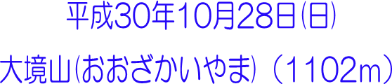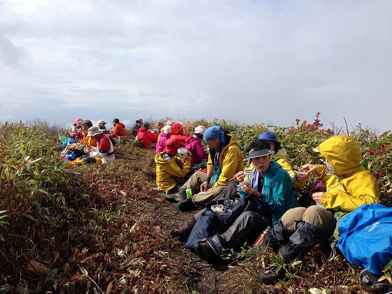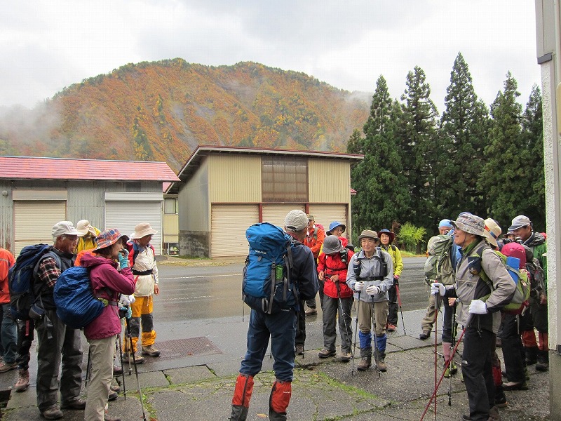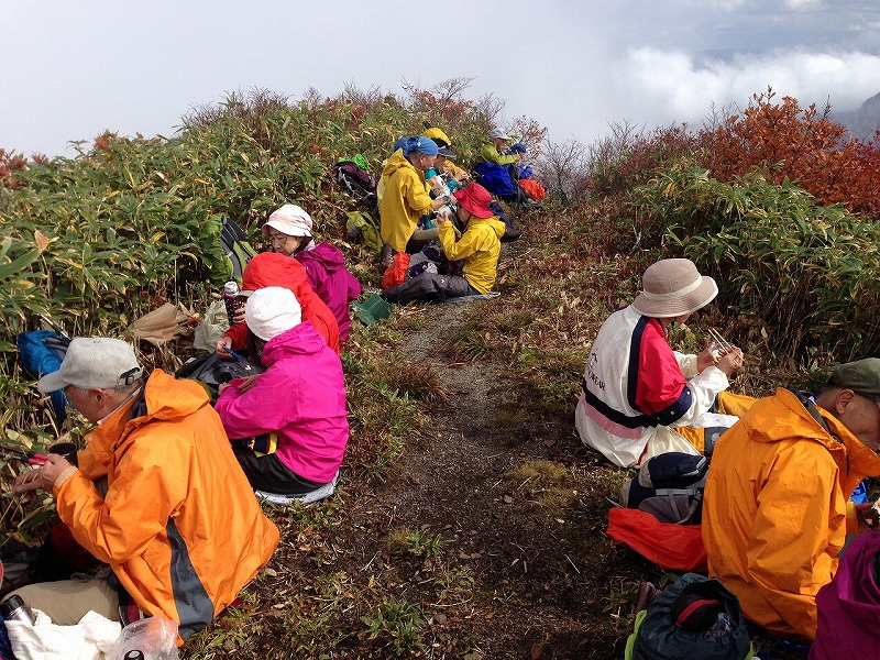 | 10月28日 | 県庁6:08 ==R13 == R113 == 白い森おぐに(トイレ休憩)7:40 == 赤芝峡7:50 == 県道260(小玉川線)へ7:55 == 中田山崎・舟山酒店8:08 登山開始8:20 …… 雨具装着 …… 脱ぎタイム8:50 …… 脱ぎタイム9:10 …… 休憩9:25~9:30 …… 休憩(H750m付近)10:00~10:08 …… (県境越え付近10:35 山頂遠望10:41)…… 水場10:45 ……休憩(役員招集)10:50 ~11:00 …… 展望地11:10 …… 池塘11:45 ……大境山山頂着11:48 後続隊着12:10 (昼食休憩) 下山開始12:35 …… 池塘12:43 …… 脱ぎタイム13:20 …… 休憩14:00~14:10 …… 雨具装着14:30 …… 中田山崎舟山酒店 下山15:15(後続隊下山15:28) 帰路バス発15:35 == 白い森おぐに(休憩)16:00 …… リナワールド前GS給油17:30~17:35 …… 県庁着17:55 |