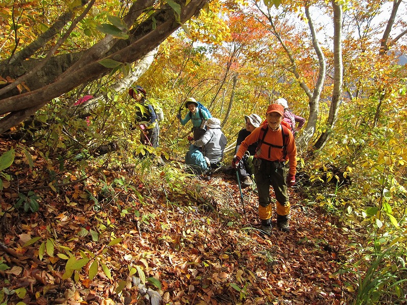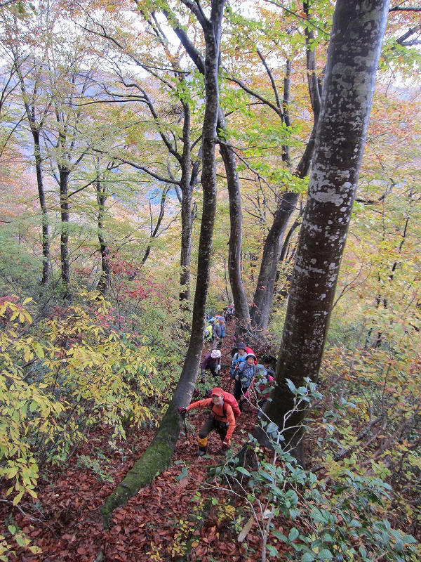 日が差し、ブナ・ミズナラ・カエデなどの黄葉・紅葉が青空を背景に輝く瞬間が疲れを癒してくれます。