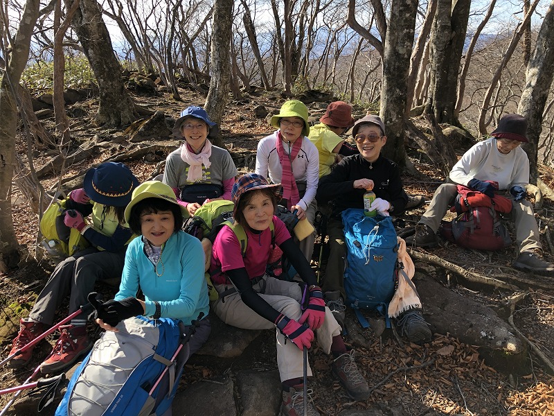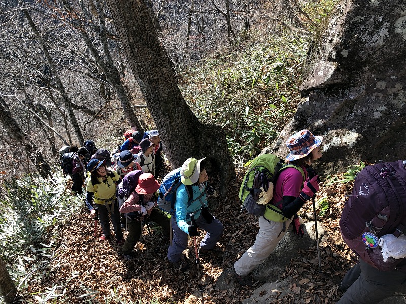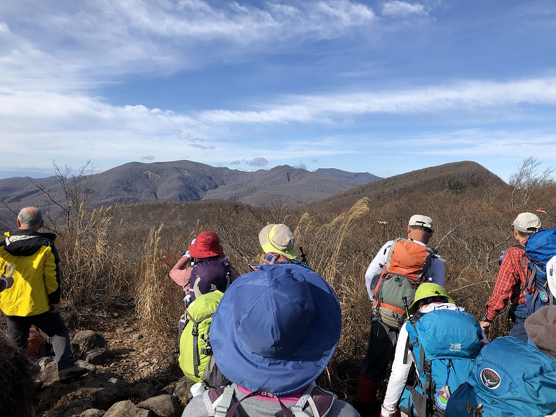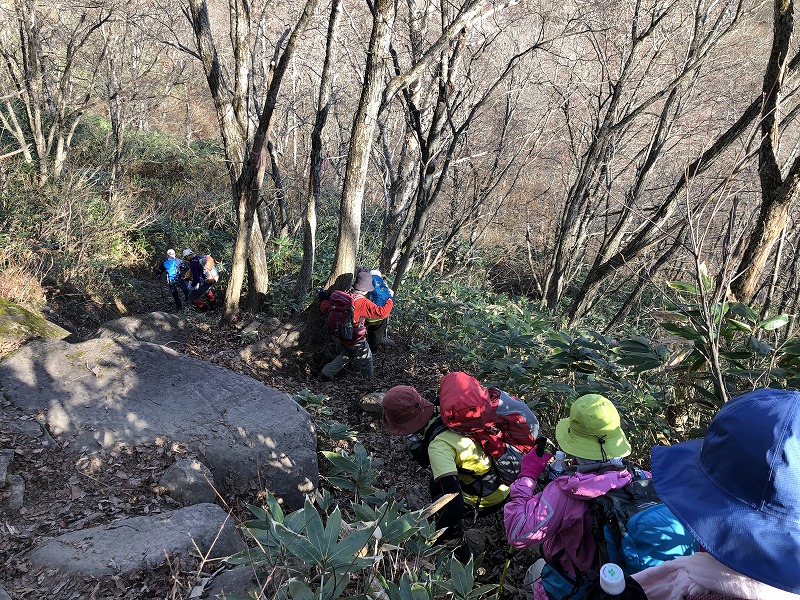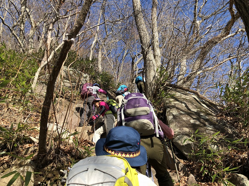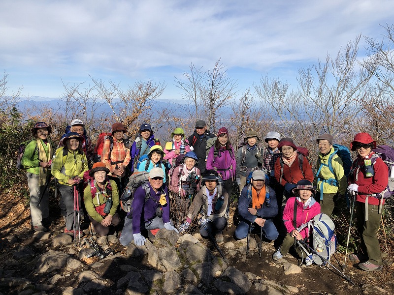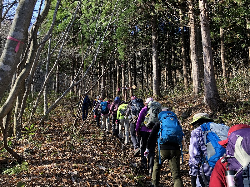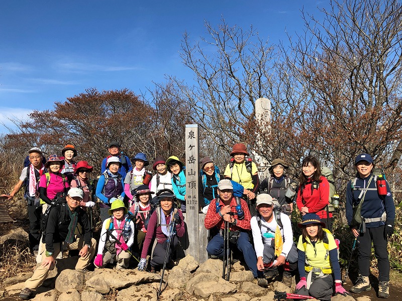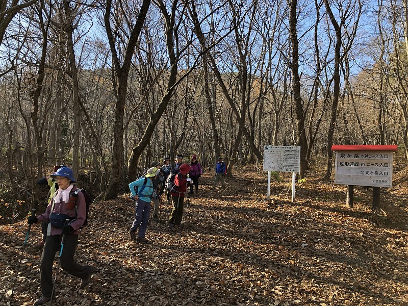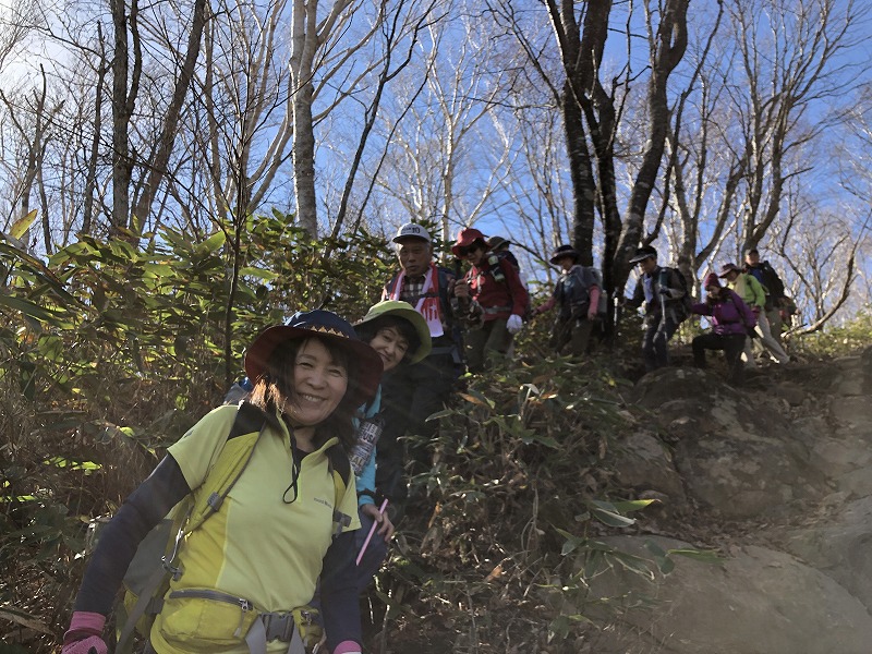 | ここ数回お天気に見放された例会でしたが、久々の青空にバンザーイ!!心も身体もゆるゆるとする。しかも今日は2/3以上が女性会員賑やかになりそう。会長の挨拶後、泉ヶ岳で一番険しいと言われる表コースを今年初めての霜柱を踏みながら出発。薬師沢を渡ると,急登がはじまりロープが張られた胎内岩を一人一人三浦さんに助けられてくぐり、生まれ変わる。岩山を登りきるとドーダン林、にせピークを過ぎると祠(泉嶽薬師如来)があり、まもなく泉ヶ岳山頂。写真を撮り少しいくと展望がひらけ、御所山から蔵王まで奥羽山脈が横たわっていた、雪をかぶった朝日連峰も綺麗。三叉路を経て北泉ヶ岳で昼食、下山は水神コースをフカフカした枯葉を踏みしめ、葉の落ちた木々の間からお日様の光がこぼれるなかを、おしゃべりの声と笑い声が響く。水神と関口を経て下山完了。途中磊磊峡へ(らいらい) 磊磊とは上手くネーミングしたものだ、字のごとく石に囲まれた絶景で、今年最後の紅葉を堪能し、満足な山行になりました。 |