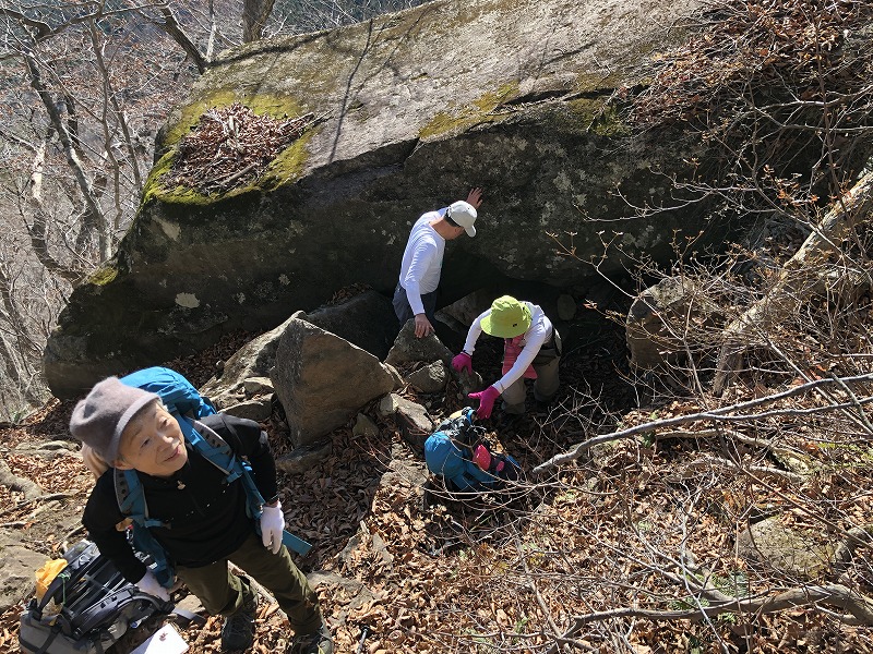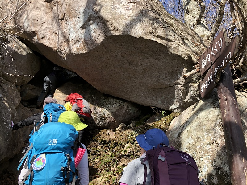 リュックを背負ったままではくぐれない。三浦さんからリュックを取り上げてもらい、生まれ変わって穴から出る。