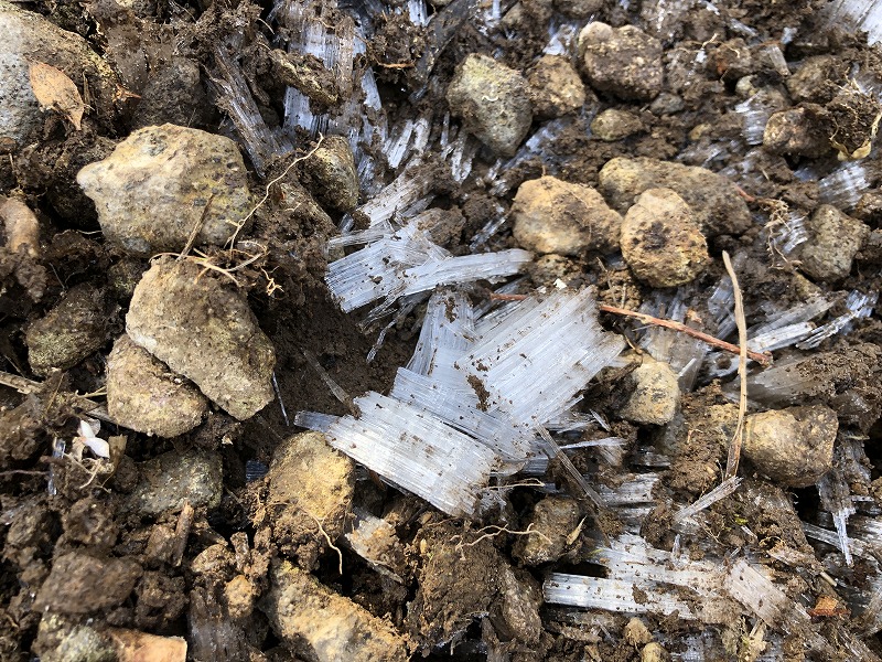泉ヶ岳山頂を越えると辺りに霜柱の塊が光ってる。今朝はかなり冷え込んだな。