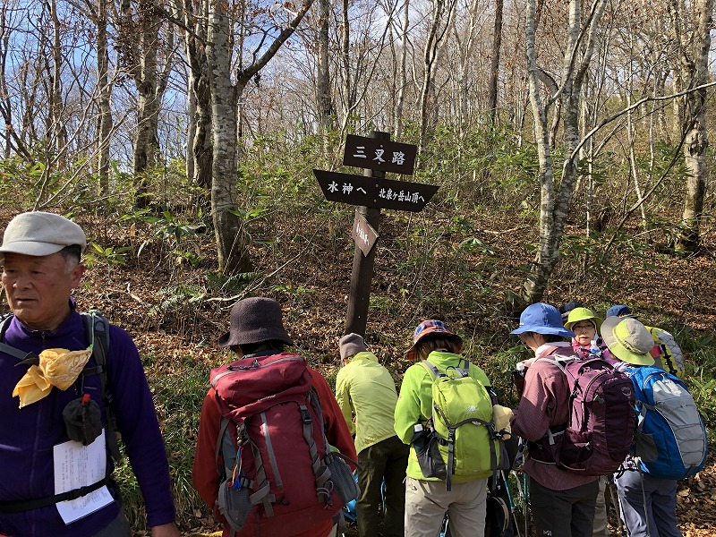 三叉路で休憩、登山者が多く往来する。帰りはここから水神方面に下る。