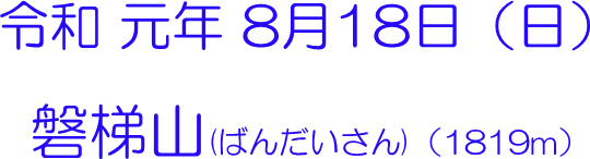 | 8月18日 | 県庁06:10==東北中央道山形上山IC 06:22==米沢==道の駅喜多の郷(トイレ休憩)==裏磐梯スキー場登山口 08:25~出発08:40‥‥休憩09:05‥‥銅沼09:20‥‥休憩09:45‥‥中の湯10:15‥‥休憩10:45‥休憩11:15‥‥弘広清水12:00‥‥山頂(昼食)13:10~出発13:40‥‥休憩14:10‥‥休憩14:35‥‥休憩15:30‥‥猪苗代リゾートスキー場‥‥翁島登山口16:05~出発16:30==西吾妻スカイバレー==白布峠(トイレ休憩)==東北中央道米沢IC==上山温泉IC==給油==県庁19:17 |