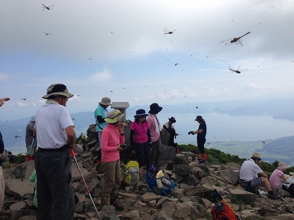 | 「会津磐梯山は宝の山よ」の、オハラ・ショースケさんの磐梯山をめざす。どちらも絶景であるが秀麗な表磐梯と荒々しい裏磐梯では姿が全然違う、今日は裏から表に縦走コース楽しみです。しかし暑い!!裏磐梯登り始めただけで汗が滴る、赤茶けた銅沼から、ガレた山肌の上に、双耳峰の櫛ヶ峰と磐梯山頂の雄姿がせまる。樹林帯に入ると直射日光が、さいぎられホッとする。弘広清水でお花畑をぐるっと廻り咲き誇ってる花々を堪能して、甘露の水を頂き、最後の急登を登りきると山頂、猪苗代湖・桧原湖・五色沼・秋元湖・小野川湖・等の360度の大パノラマが迎えててくれた。昼食をしている頭の上をトンボが乱舞する、何回来ても感動です。下山は左手に猪苗代湖を見ながら、危険な足元の悪い長い山道をひたすら下る。やっぱり暑い疲労困憊のなか、最後の難所ロープの垂れた岩を一人一人慎重に下る、もう沢山と思っているとスキー場に出た、そしてバスが見えたときは身体の力がぬけた。磐梯山はドラマチックな山でした。Iさんからのワンポイントアドバイス!登山後は水で足(太腿から)を冷すと翌日筋肉痛が楽になるそうです、お試し下さい。 |