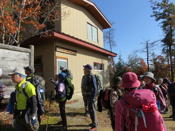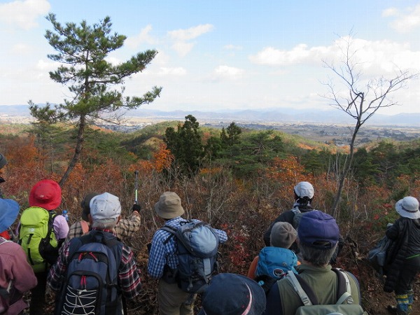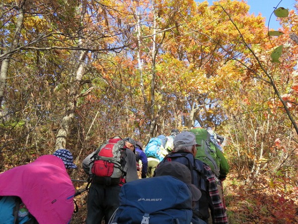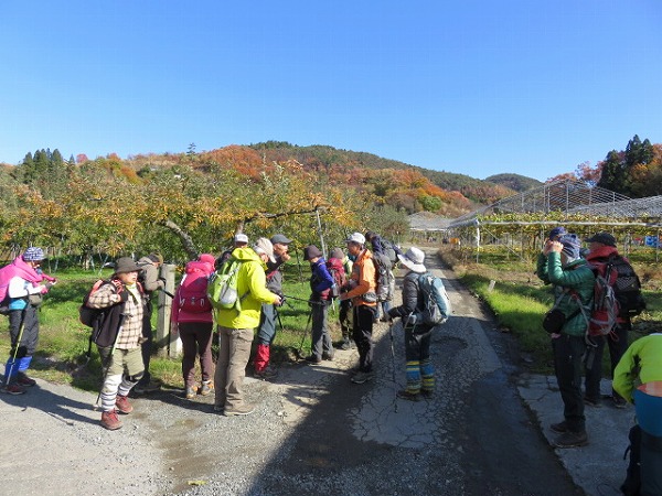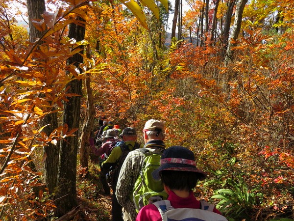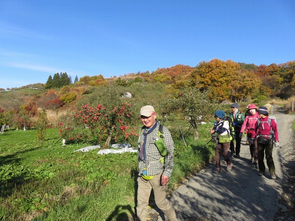 山形百名山の里山 高戸屋山・秋葉山の二座を目指す。晴天の予報が、明け方には小雨がパラつき、天候の成り行きが懸念されたが、出発のころには雨も上がって、登山日和の予感。バスの向かう先には飯豊の山々が雪をまとって輝いている。川西町の中心部に位置し、町の眺望がきく山ということで期待が膨らむ。スキー場の脇を通って山に入っていく。緩やかな尾根道で、マウンテンバイク大会のコースとしても利用されているというだけあって、道幅があり歩きやすい。小さなアップ・ダウンを繰り返し、展望の良いところでは小休止をとってふもとのダリヤ園や晩秋の置賜盆地の景色を堪能。登山道脇にはクリタケ・なめこなどのキノコが顔を出す。所々に熊の落とし物があり、獣の臭いが漂ってくる。季節外れのイワカガミの花が一輪咲いていた。ミズナラなどの黄葉が光を受けて輝く。山頂まで500mの看板から急登を登りきり、山頂着。置賜盆地の向こうには白く輝く蔵王連峰の姿が、北側には雪の大朝日岳の雄姿が望める。しかし、日頃見なれている蔵王とは異なり、初めはなかなか蔵王とは特定できなかった。山は見る角度によって違う表情を見せる。蔵王の雄大な稜線を望むことができるこの山は絶好の展望台であった。 下りもアップ・ダウンを繰り返す。粘土質の急な下りは前日の雨でぬかるんで滑りやすく注意が必要。 予定よりも早く下山し、東回り登山口の鏡池のほとりで昼食休憩。池の対面の所は原田甲斐の祖父の代まで居城していた城跡で、原田城址(藤ケ森城)とAさんから伺った。大河ドラマになった「樅木は残った」で有名な樅の古木がそびえているとのことである。 二座目の秋葉山へ向かう。途中、小松駅で休憩。町民管理の駅で、まちなか活性化のため、駅を中心に様々な取り組みをしているとのことで、町民が集えるようなスペースがあり、俳句などが掲示されていた。 秋葉山登山口着。果樹園の中を通る道。真っ赤なリンゴがたわわに実をつけている。おいしそう!紅葉が日差しを受けてまぶしい。快適な登山道を進む。一の山(389m)の鳥居は上部が破損し、笠木・神額が下に落ちている。二の山(477m)と進むと、秋葉山荘がある。地元の山岳会のメンバーが集うところらしい。ここからは南陽市宮内地区の街並みを見渡すことができた。飯豊の山並みも見えるはずだが、雲がかかっていて、はっきりとは見えない。ここから山頂まではいったん下ってまた登り返しの一登り、山頂からは眺望がきかない。下山途中の木々の間から、雪をまとった大朝日岳が望めた。向山公園に下山、帰路につく。途中、観光客で賑わう熊野大社で小休止。大イチョウが太陽の日差しを受け、きらきらと輝いていた。帰路途中のバスの中から蔵王の雄大な姿を望み、最高の眺めと歓声が漏れた。晩秋の陽だまりハイクの感じで楽しい山行であった。 |