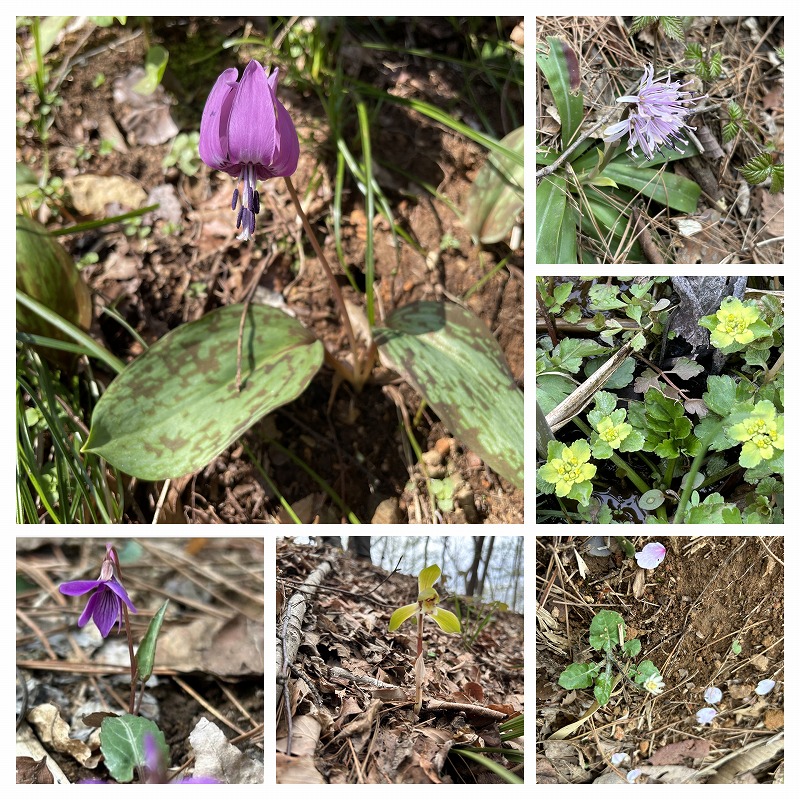 途中に出会った花々 カタクリ、ショウジョウバカマ、ネコノメソウ、スミレ