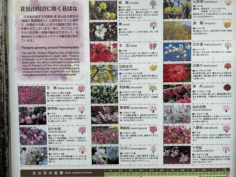 | わくわくしながら、花見山に向かう。しばらく下っていくと途中から、桜、梅など色とりどりの山道にかわってくる。 | ||||||||||
