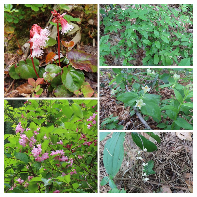 光兎山で出会った花①: 左 イワカガミ、タニウツギ、