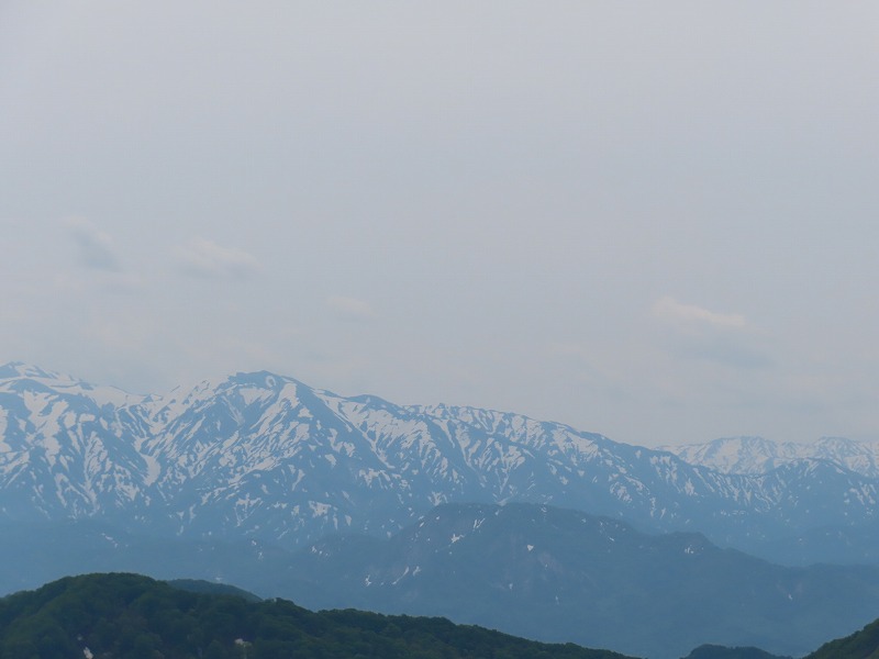 | ニセピークに何度かだまされるもついにハイタッチで山頂へ。新潟の山、その先の日本海と粟島、なじみの朝日、飯豊を見渡す | ||||||||||