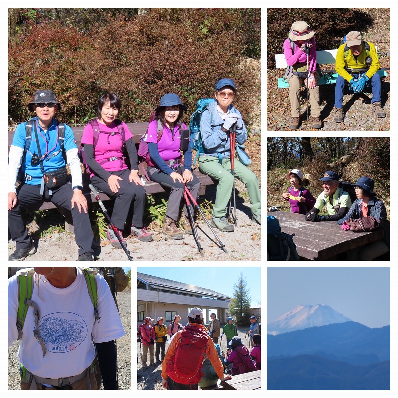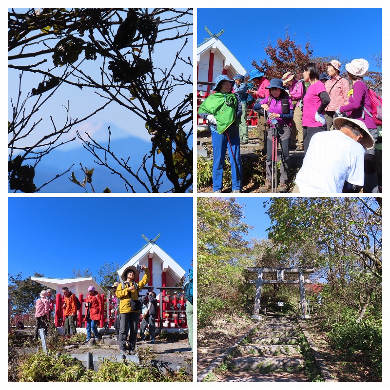 | つくりの富士山神社に到着。お参りして記念写真を撮り景色を眺める。Gさんが梢の間から雪を頂いた富士山を発見し | ||||||||||