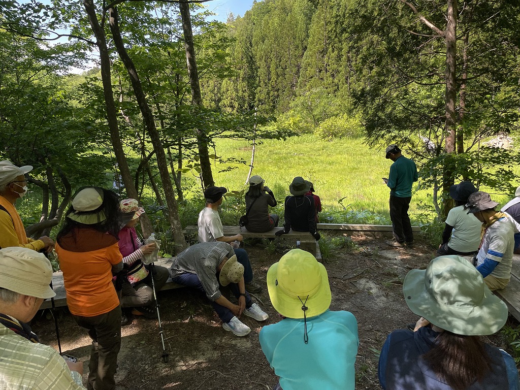 湿原のトップで休憩 屈伸運動かお疲れ様か