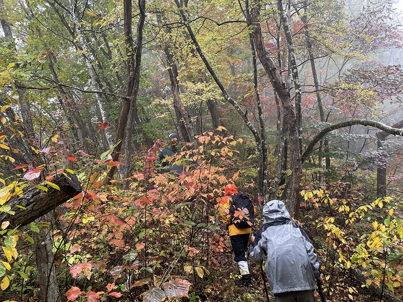 | 下りは、雨と落ち葉で滑りやすく、ロープをしっかり掴んで慎重に。30分ほど歩いて三吉山に到着。 | ||||||||||