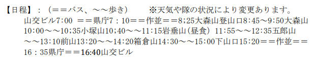 7:10県庁==8:00大滝ドライブイン==8:41大森山登山口~~9:40大森山~~10:10小塚山~~10:53岩垂山 ~~11:24ゴロ山(昼食)12:08~~12:32前山~~13:24箱倉山~~14:03下山口==森の駅==15:55県庁 |