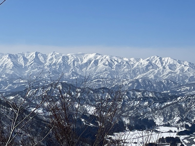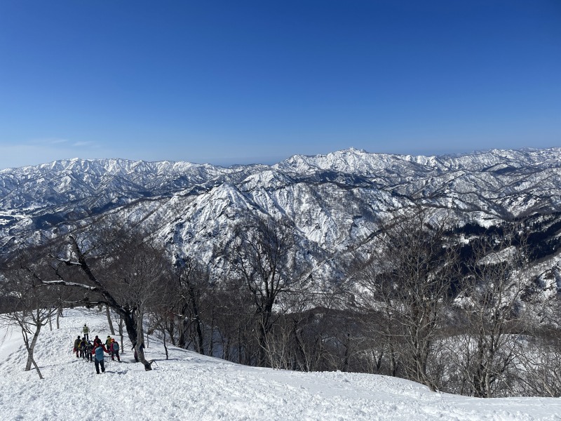 | 近くの祝瓶山、真っ白な朝日連峰、そして飯豊連峰、まだあまりなじみのない新潟の山々も臨む大パノラマが目の前に。 | ||||||||||