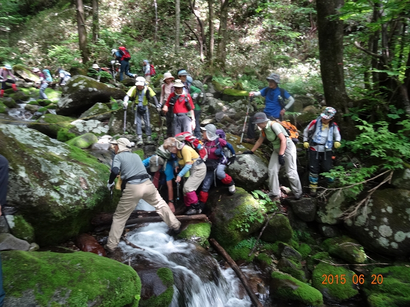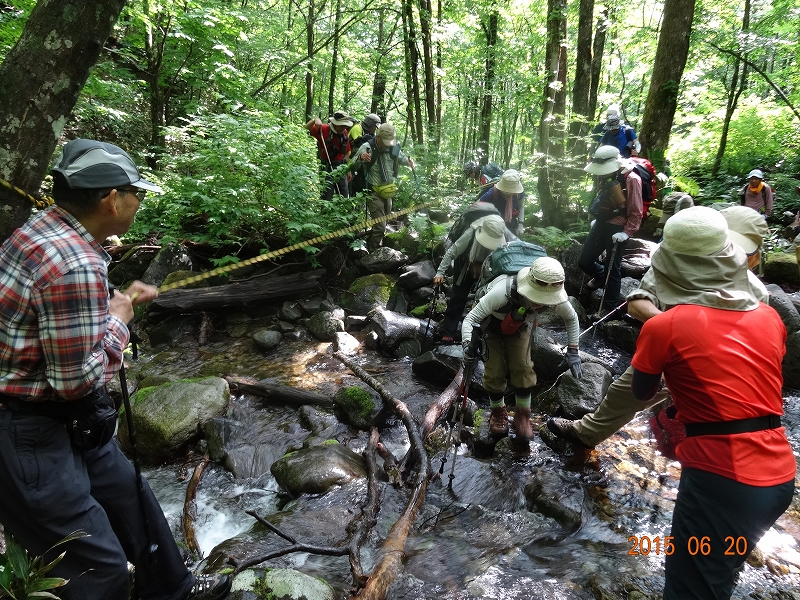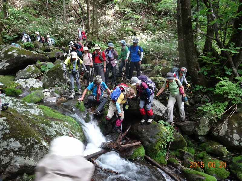 ブドウ沢の駐車場でリーダーより熱中症・雷・増水時の渡渉についての注意点などを聞き、登山開始。木漏れ日のブナ林を進み第一渡渉地に至る。こちらの山域は前日・前々日と雨だったということで、水かさが増しているように思われる。苔むした石・岩は滑りやすく、慎重に互いに助け合いながらの渡渉となる。何とか第一関門クリア。