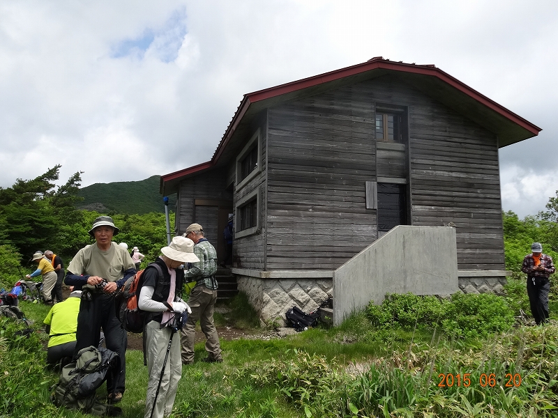 第二渡渉地はさらに水量が多く激しく水しぶきをあげており危険が伴う。ベテランの会員が安全なルートを確保してくれて、全員無事に渡り終えることができた。助け合いに感謝。緊張から解放された耳に林間に響く小鳥(ミソサザイか?)の美しい歌声が飛び込んできた。ホトトギスの声も聞こえる。ここまではあまり標高をかせいではいないが、この後見通しのきかない樹林帯の急登が続き、たっぷり汗を絞られる。疲れをいやしてくれる可憐な花々もすでに時期を過ぎており、わずかにオヤリハグマ・カニコウモリなどの地味な花が咲いている。急登を過ぎるとブナ林の広い尾根に至る。展望はきかないが、足元にギンラン・コバイケイソウなどの花が見られるようになる。あまり人が入っていないのか、やぶが覆いかぶさっているところや、前日までの雨のためか、歩きにくい泥んこの悪路もある。八方平避難小屋が近づくにつれ、サラサドウダン・ウラジロヨウラク・ハクサンシャクナゲなどが目に飛び込んでくる。小屋のあたりはハクサンチドリの群落、珍しい色のウツギも今を盛りと咲いている。花博士のSさん、「ニシキウツギかも!」(紅花二色ウツギ?)。雲行きが怪しくなってきたので、南雁戸山へと急ぐ。タカネバラ・ミヤマウスユキソウ・ミヤマハンショウヅルなどを横目に先を急ぐ。ガレ場に出ると展望が開け、今来た道などが見渡せるが、あいにく曇り空になってきて蔵王など山頂部分は見られない。南雁戸に到着。眼下には蔵王ダムを望むことができる。雨の心配等があったので、狭い山頂で早めの昼食を済ませて北雁戸山へ向かう。一気に下ってまた登り返す。急下降のため先を行く人がはるかかなたに小さく見えるような感じで、慎重に歩を進めるがなかなか間が縮まらない。一時のことがやたらと長く感じられる。小雨がぱらついてきた。急登を登り詰め北雁戸山頂に至る。曇天であまり展望がきかない。記念写真を撮って早々に下山開始。またまた緊張を強いられる急下降。なじみの蟻の戸渡りがなんだか違う印象がある。全員無事難所通過。
