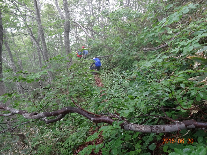 降りの登山道は狭く、倒木が道をふさぎます。油断すると左の崖に。