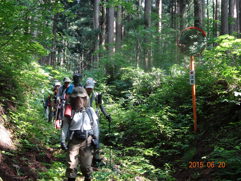 滑川分岐からは新山方面へ。炭焼き小屋跡の多く残る古くからの道だそうだが、あまり人が入っていないルートのようでやぶ漕ぎに近い状態になる。途中数人が地蜂に刺されるハプニングあり。ミズが群生していて、「おいしそう!」との声が上がるが、今日は山菜取りはなし。花期を終え、実を付けたサンカヨウの群落もあり、花の時期はさぞやと思われる。林道に出るとカーブミラーがあり、かつては車が通れたのであろうと思われるが、今は全く通れそうにない。林道をひたすら下って予定よりも早く駐車スペースに無事到着。
