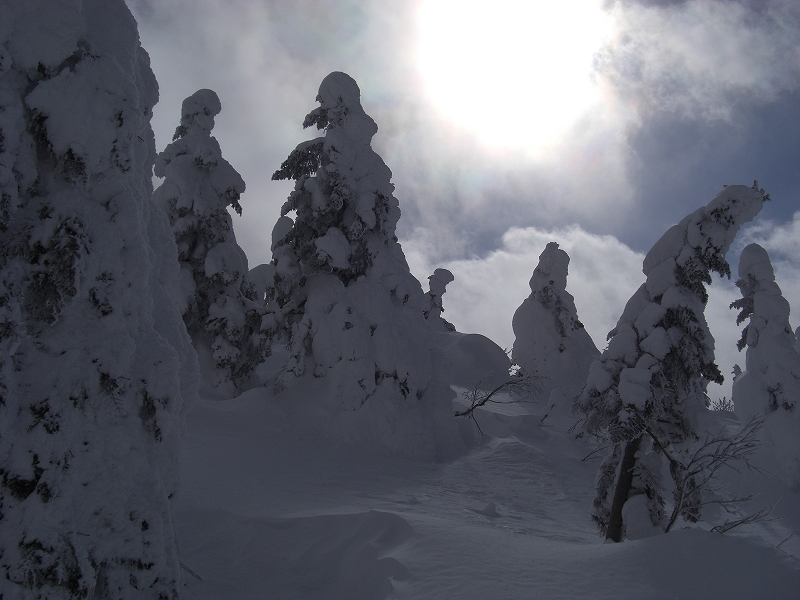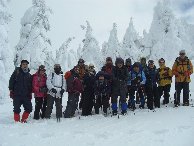 余り良い天気予報ではありませんでしたが ロープウエイの乗り場には樹氷鑑賞の人や我々の様なトレッキングの人が沢山並んでいる。スキー客は混むのでリフトを繋いで山頂に行くのだそうです。高原駅からユートピアゲレンデの端の方を1列で登って行く。樹氷原コースに入り パラダイスゲレンデに入る少し手前から(樹氷原コース76番)樹氷の中に入ってゆく 少し風はあるが素晴らしい景色です。ラッセルの経験を全員でして頂こうと 先頭を順に交代する 良い経験ができました。山頂駅で休憩をしてから 地蔵岳に向かう 山頂は風が強く写真を撮り直ぐ下山する。又山頂駅に戻り昼食を食べて 下山はザンゲ坂を下る。途中晴れて来たので 写真や景色をゆっくり堪能して高原駅に戻りロープウエイに乗り無事山麓駅に着く お天気が心配でしたが 満足な1日でした。 |