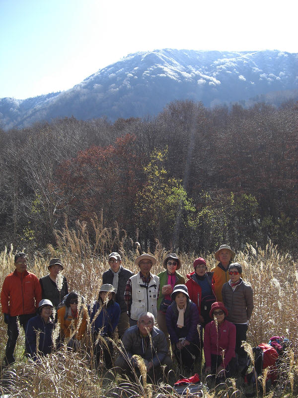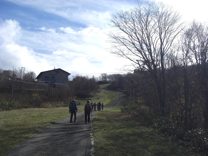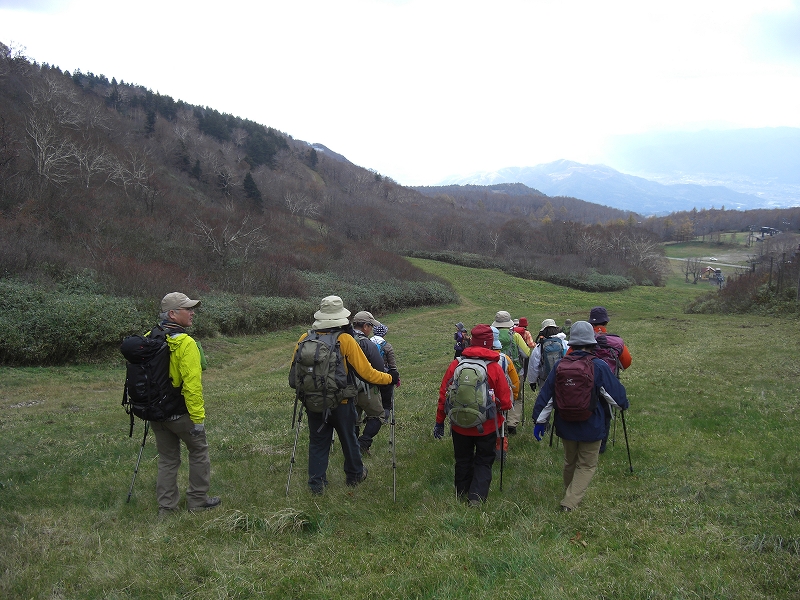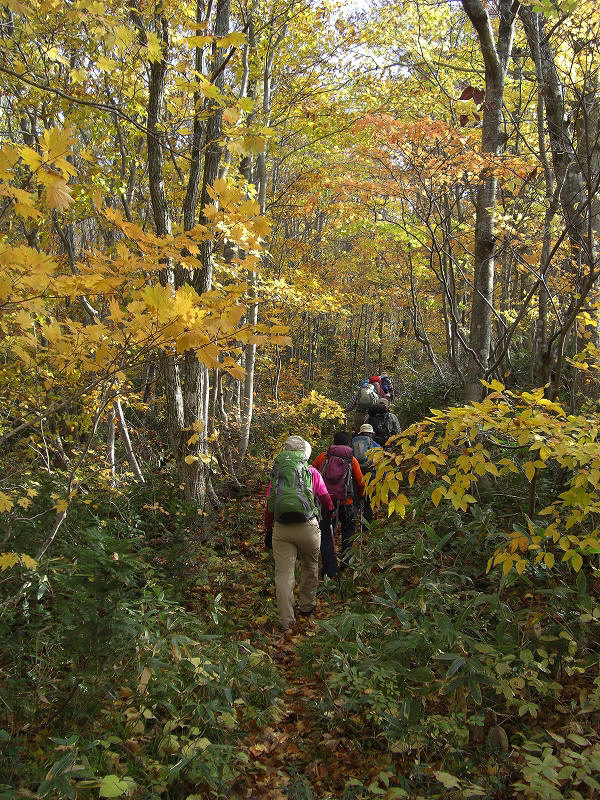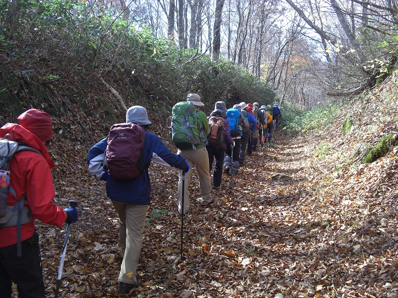 今回の山行は、古の登山道を通り、五郎岳を北側から巻いて、東側のヨシ沼に行き、西側より、雁戸山を見ることである。蔵王温泉バスターミナルをスタートし、上の台ゲレンデを通り、温泉第三線リフト降り場から七曲り登山コースに入る。今日は、冬型の天気予報で、雪を覚悟してきた人も多かったのではないかと思います。しかし、晴天に恵まれ、温泉街、上の台周辺は紅葉が真っ盛りで、落ち葉を踏みながらの登山は、爽やかな気持ちになる。