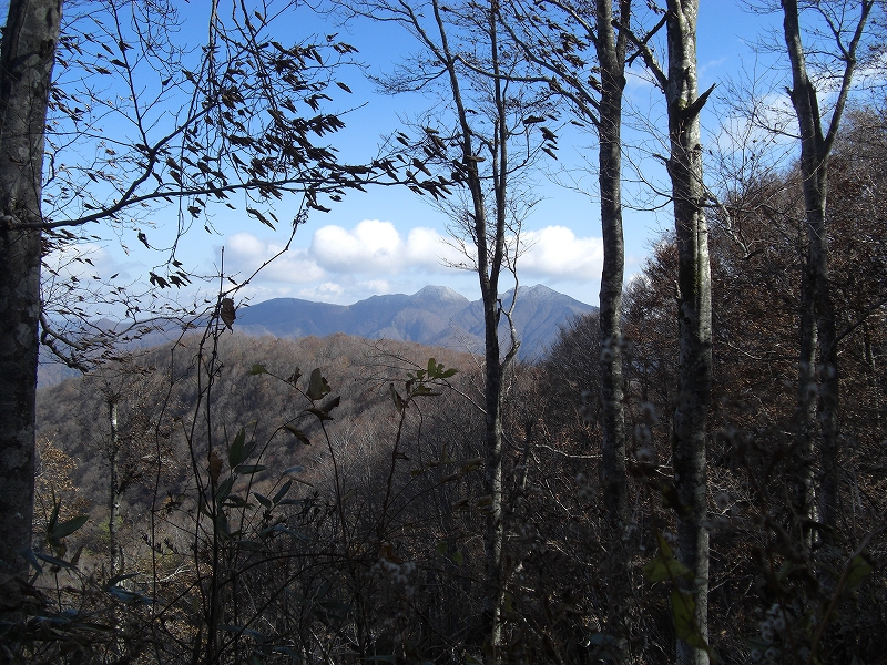 コタン散策路分岐で昼食、片貝沼からここまでのコースは、紅葉の名所であるが、ヤマモミジの葉も全部落ちていました。時間も少し遅くなっていたので、イロハ沼、観松平コースからキャラボク原生林コースに変更、樹齢何百年のキャラボク群は、本当に見事で感動しました。下りの祓川コースはなだらかなコースと思っていましたが、落ち葉に隠れた、ゴロ石に何回かつまずき、上り下りも多いコースだと気づきました。しかし、紅葉のフィナーレを彩る、谷間に残ったモミジやブナ、コシアブラ、ドウダンなどが鮮やかで、今日の厳しい山行を癒してくれました。 |