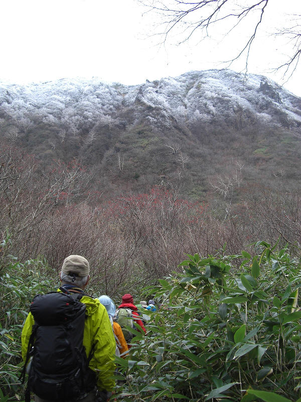 三宝荒神山の霧氷を眺めながらヨシ沼を目指す