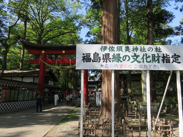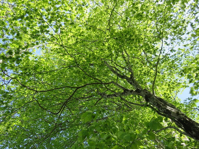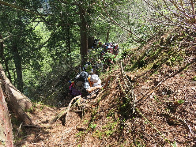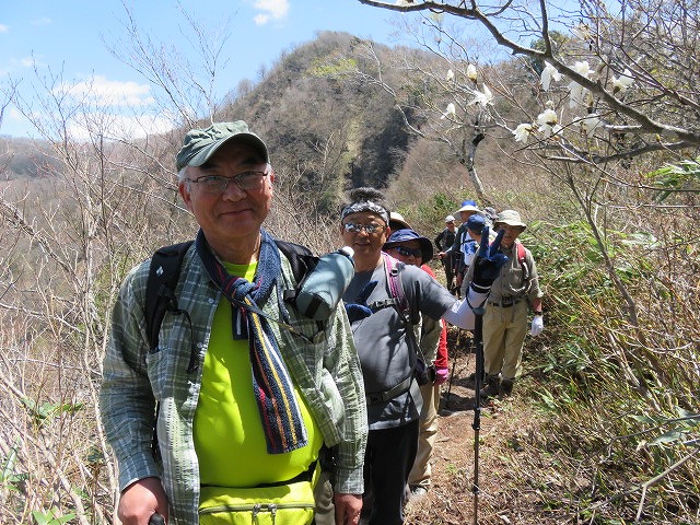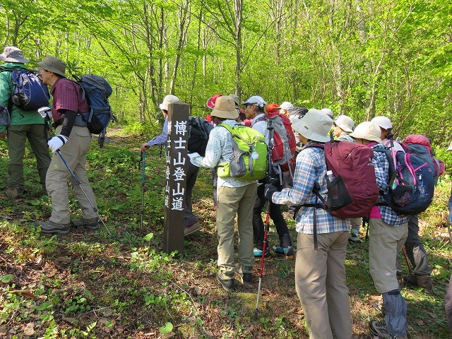 | 東北一円が晴との予報が出ており、20人ずつ2台で出発する。登り口に予定より1時間余早く着く。会長から、山名の由来(太刀を「佩かせ」が「博士」になった)を聞いてスタートする。ブナの新緑が美しく爽やかな風が心地よい。ムラサキヤシオツツジ、タムシバが緑に映える。間もなく「道海泣き尾根」の名に恥じない岩場の急坂を、木の根、ロープ、鎖を頼りによじ登る。時間に余裕があるのでゆっくり行く。イワナシが多い。しゃくなげ洞門(今は立ち入り禁止)を右に見る。シャクナゲの蕾が目を引く。急坂が終わり下山路との分岐を過ぎ、社峰を越えたら山頂である。飯豊連峰、磐梯山などがうっすらと望めた。他に登山者がいないので、40人が狭い山頂を独占してお昼にする。分岐まで戻り、近洞寺跡尾根を下る。こちらも急だが岩場がないので助かる。クロベの巨樹が次々に現れ、中には形が複雑で説明に困る樹もある。ゆっくり下り予定より1時間早く車に着く。時間があるので、会長の発案で会津美里町の、博士山ゆかりの伊佐須美神社に詣でる。社殿が2008年に焼失し仮社殿を設け、再建のための募金集め中とのこと。往路と同じ道の駅に立ち寄り無事、県庁に帰着。新緑を楽しんだ良い山でした。 |