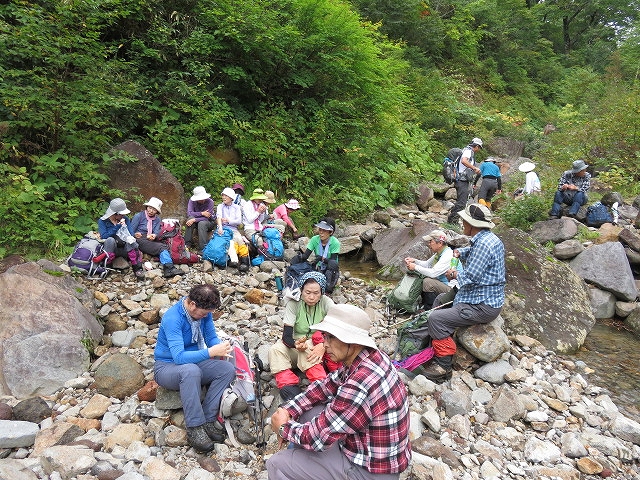 御沢からの分岐点で一息。標高差200mの沢登りに、2.5時間費やした