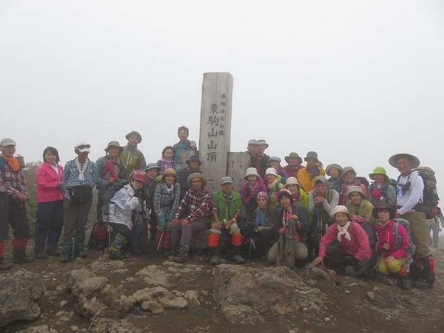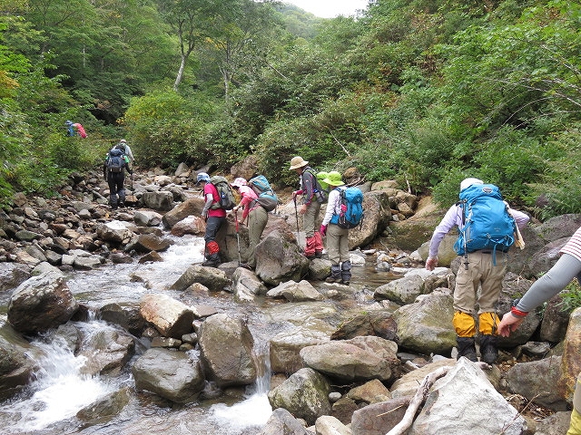 栗駒山は、会員の方なら何回も登った事があると思われるが、今回の御沢(表掛)コースに行った方は少ないと思う。 出発前に、会長より挨拶がある。今日の表掛コースは、2008年の岩手宮城内陸地震で閉鎖になり、5年後の2013年に再開したとの事。登山口は標高800mであり、山頂までは800以上の標高差がある。そして、沢が200mあり気を付けるよう注意があった。 登山口は、刈払いがされ、ブナ林帯を順調に御沢まで行く。沢に出ると一気に景色が開け、そこでしばしの休憩。ここから「石飛八里」といわれる、本格的な沢歩きが始まる。巨レキの沢のルートを探しながら登る。ワクワクして楽しい。10数回の渡渉を繰り返し、水の洗礼を受けながら、会員の手助けを借りて、大日沢出合までたどり着く。 沢の最上部のハシゴ滝から、左の巻き道のロープを登ると滝の上部に出る。平坦なせせらぎを通り過ぎるとダケカンバの林が広がり、ロープのある急斜面が数か所ある。登りきると草原が広がり、気分も爽快だ。もう、すっかり秋の装いになったお花畑で昼食を取っていると、下方からガスが上がって来る。 御室の直下には、チョウジギクやシロバナトウウチソウ等が咲き乱れる。 御室の岩壁から虚空蔵十字路を目指す。登山者が少ない為、ルートが判りにくく苦労をするが、無事、須川分岐に着き一安心。 紅葉が始まった山頂で記念写真を撮り、すぐに、こまくさ平へ下山する。 登りの御沢コースが7時間25分、下りの中央コースが1時間05分。 同じ山でも、コース取りによって、ずいぶん時間が違う事を改めて思い知らされた。 |