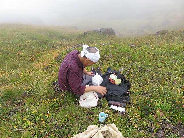 | 9月24日 | 県庁 5:05==長者原SA 6:45==登山口 7:50~~御沢出合 9:10~~大日沢出合 11:40~~12:55 御室下のお花畑(昼食)13:30~~御室 13:45~~須川分岐 14:50~~15:15 山頂 15:20~~16:25 いわかがみ平 16:40==長者原SA 18:05==県庁着 19:30 |