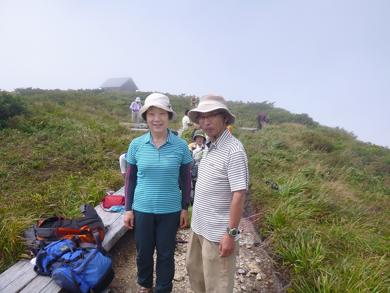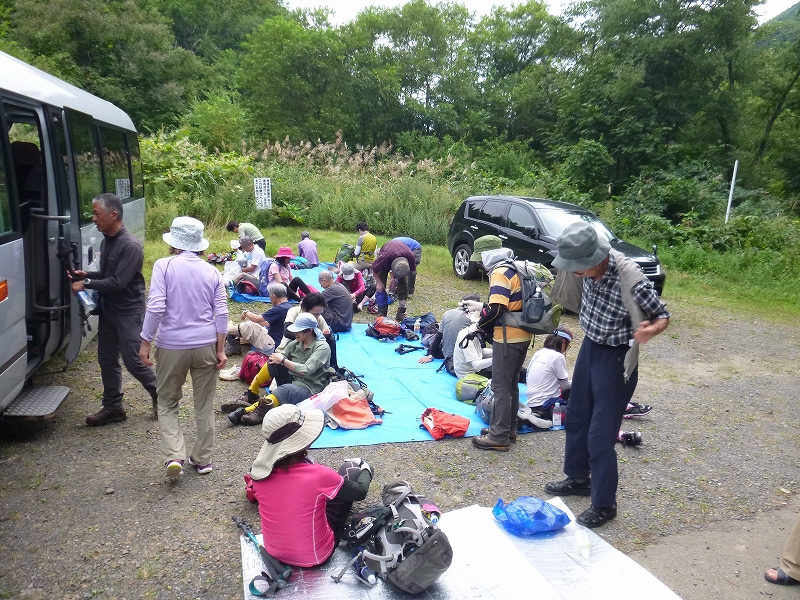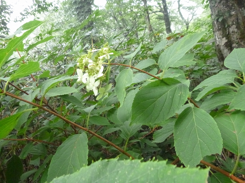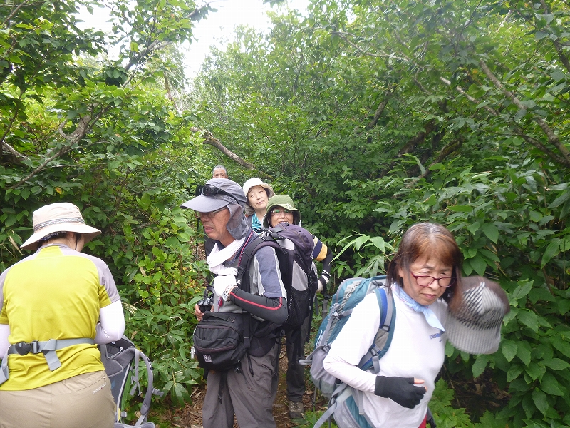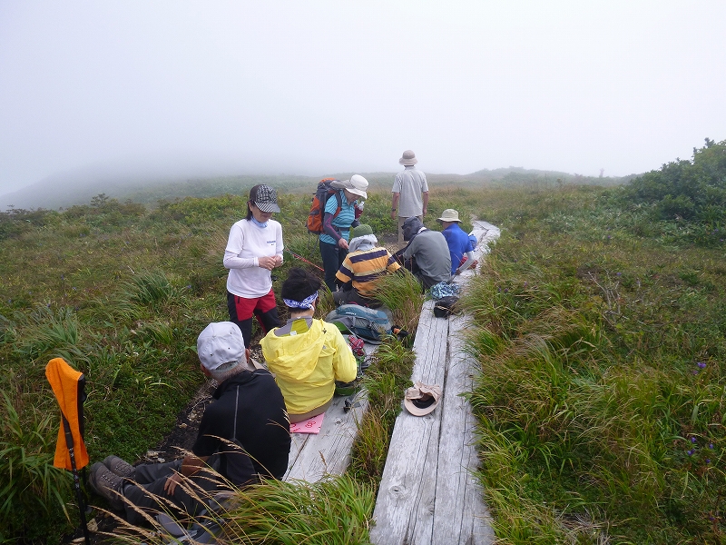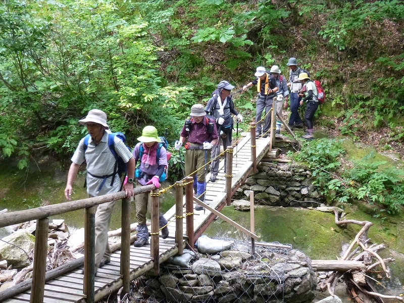 今日の目的地、虎毛山にバス一台で出発。登山口の手前の駐車場で下車、会長の挨拶で虎毛山の由来と阪神タイガーズが優勝した時、虎が付く山で日本で一番高い山がここ虎毛山なので、お祝いに関係者の方々が登ったという話を聞き出発。左手に赤倉沢の川の流れを見ながら、緩やかな道を暫く歩く、純白のウメバチ草が咲いていた。赤倉沢に架けられた木の橋を渉ると渡渉点に着く、ここから高松岳分岐まで展望のない急登を600m一気に登る、なにせ暑い!でも高松岳分岐に着くと、夏の終わりを感じる時折吹くさわやかな風がここちよい、避難小屋が見えたらまもなく山頂到着。湿原に敷かれた木道で昼食を頂く。小屋で会長のお話の、阪神タイガーズの大きな黄色の垂れ幕を見つけました。帰りは登ってきた道をひたすら下る、ほとほと嫌になった頃渡渉点に着き、冷たい川の水で癒され元気が出る、無事到着。 南の方は台風が来てるというのに、恵まれた山行になりました。 〔今日出会った花・木〕 サラシナショウマ・リョウブ・ノリウツギ・クロヅル・テンニンソウ・ツリフネソウ チョウジギク・ゴマナ・オトコエシ・ウメバチソウ・他 |