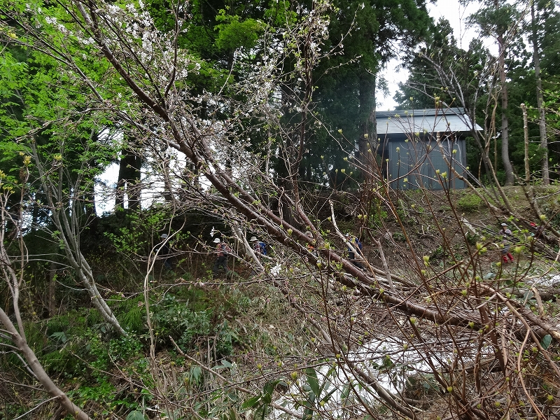 兜山 会長より挨拶(兜山は米沢から見ると兜の形に似ているとの説明)、標高差約600m 林道の橋を渡り杉林の 中を歩く。林道終点から前日の雨で滑る沢沿いを登る。所処にロ-プあり尾根へ、尾根からは、ますますの 急登連続で所々にロ-プあり、木の根に滑りながら登る。途中、残雪が少し在りコブシの花が咲き始めていた。 山頂からは、霞の上で何も見えない。早めに下山をする。 天狗山 会長より挨拶(計画変更し沢コ-スを登る。事前調査、時間短縮) 二の鳥居から登山道にはいり沢に沿った狭い道、道は、足場も良く,滑滝下で沢を渡る。渡った所が崖下、一番の難所で、ハシコ゛とロ-プで登り上の狭い崖道を滑滝の上でトラバースする。 護摩堂からも急登が続き、姥神の所の崖をロープ利用して上がる。 急登はここまで、登山道は足場が切られよく整備されていた。途中の窪地に残雪が多くあり、イワウチワ、椿が咲いていた。 天狗山山頂からは、展望が良く晴れ間に、蔵王山・吾妻・朝日連峰の山々が眺められた。 下山は、途中のロープ・ハシゴの安全を考慮し、護摩堂より林道を歩く。途中にイワカガミの花が多く咲いていた。 |