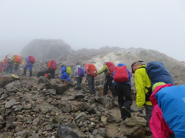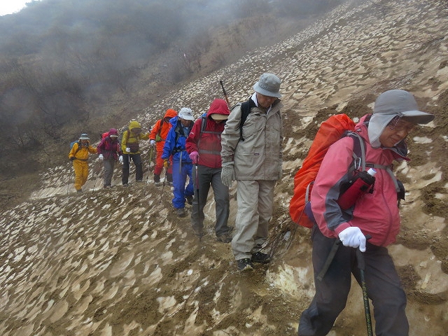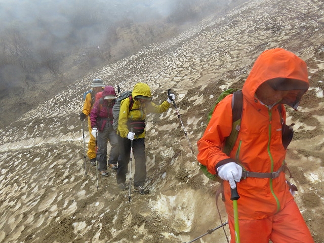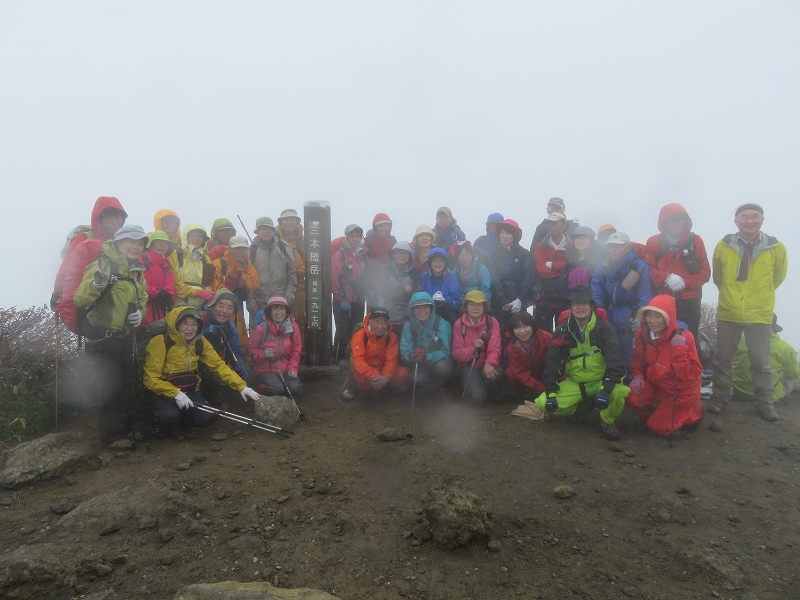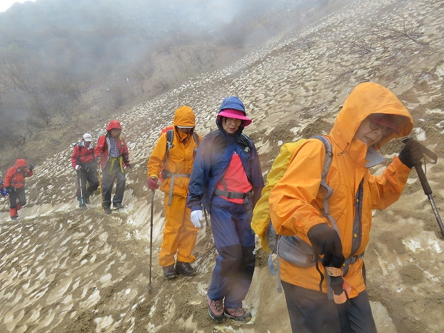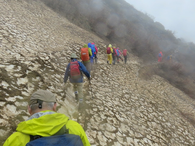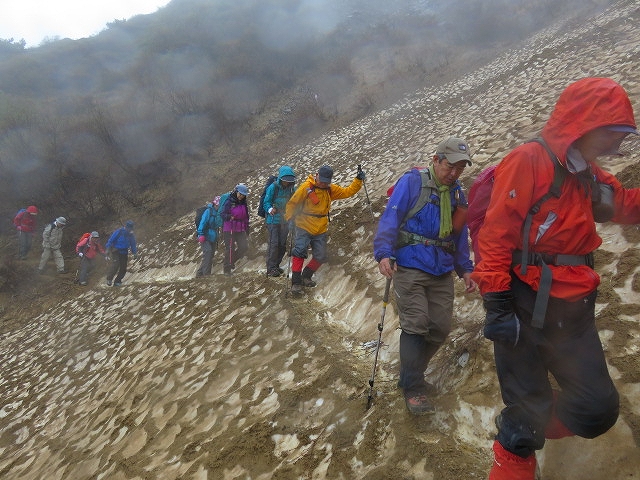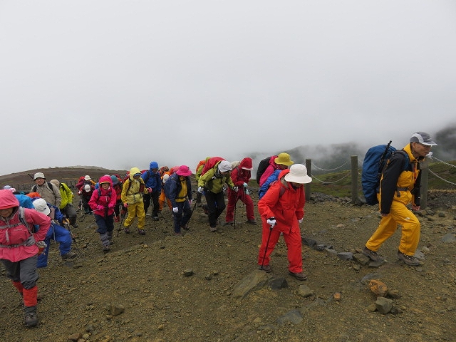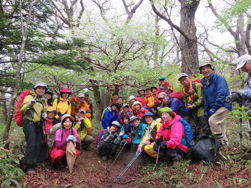 小雨が降る中 栃木県はきっと晴れているだろうと期待しながら中型バス2台はロープウエイの駐車場へ向かうが残念 小雨で山の上はガスで見えない ロープウエイの山頂駅で 会長から 新人さんの紹介と浮石についての注意を受け そして2月に起きた 那須スキー場近くの雪崩れで亡くなった8人の為に黙とうをして出発をする。茶臼岳 朝日岳と石ころゴロゴロのガスで遠くが良く見えない道を行く 朝日岳を過ぎた辺りからコメバツガザクラやミネヤナギ等少しずつ花が見えて来た。 那須岳の最高峰の三本槍岳に着いても まだガスの中で何も見えない 昼食後下山する。北温泉分岐より 緩やかで サクラやシャクナゲが咲く 中の大倉尾根を下りスキー場分岐に着く、 此処からは見事なシロヤシオ並木になる。 そして長い長い駐車場までの下りになるが シロヤシオに癒される。今回の例会から トランシーバーで列の前後等の連絡を取り合ってみた。良かったと思いました。 |