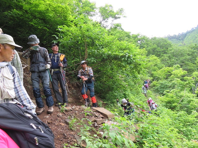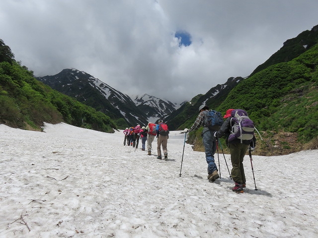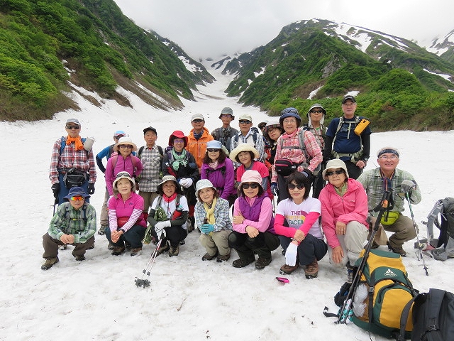 天候にも恵まれ、飯豊の石転び沢の雪渓を登ると思うだけで、心が弾む。 天狗平で白田会長の挨拶。隊列を乱さない事、雪渓を踏み抜かない様にとの注意がある。 天狗平の標高が410m、石転び出合が860m。標高差は450mしかないが、危険度はかなり高い。 温身平までは、車道を歩く。道路の脇にはホウチャクソウなども咲いている。温身平に着くと正面に、残雪を頂いた飯豊連峰が姿を現す。ここで脱タイムを取る。梅花皮沢の渓流の音を聞きながら歩いていると「梓川みたいだね」「上高地に来たみたい」「山形の上高地だ」との声が、あちこちから聞こえてくる。砂防ダムから、登りが始まる。斜面の狭い登山道でのアップダウンは、かなり危険だ。うまい水の看板の所で休憩を取る。冷たくて体にスゥーと入っていく、本当にうまい水だ。 まもなく、雪渓に降りる。あちらこちらに、クレバスがあり、石も転がっており、緊張が増す。リーダーの後に付いて、ひたすら雪渓を登ると、目的地の石転びの出合に着く。いつも見えている巨大な石は、珍しく、今年は雪に埋もれている。到着した時は、なんとか梅花皮小屋が見えたが、すぐに姿を消した。それでも、雄大な石転び沢の絶景が楽しめた。記念写真と昼食を取り、下山を開始する。 最初に沢を渡った所に戻ったらビックリ‼ スノーブリッジに成っており、厚さ50~60cmだった。夏道に迂回する。温身平では、けもの歩道を経由し、ぶな林の森林浴を楽しみ、全員無事下山する。 |