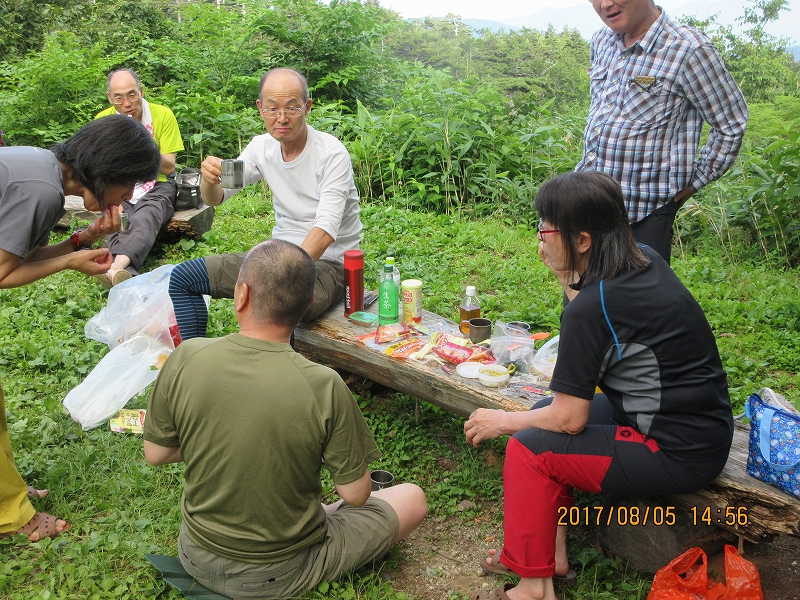 大朝日岳山頂にて昼食タイム~残念ながらガスで眺望が利かない