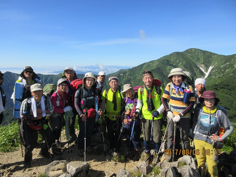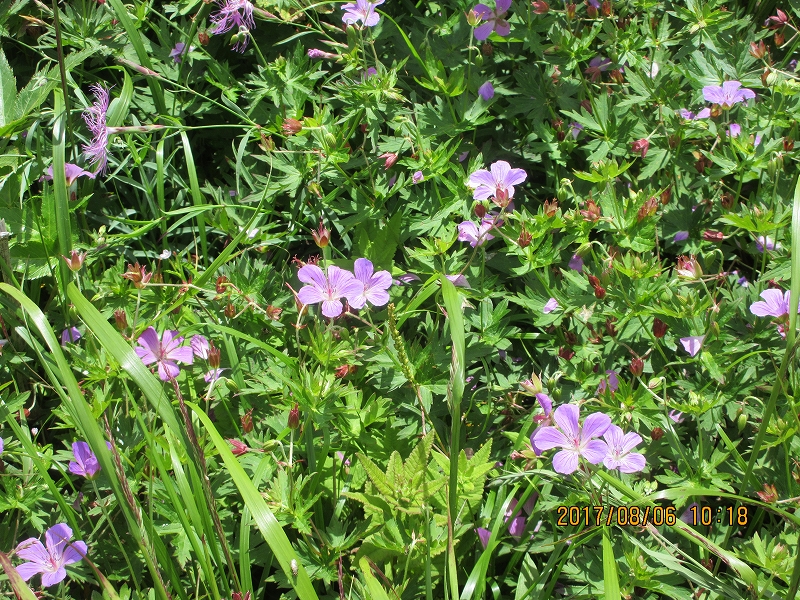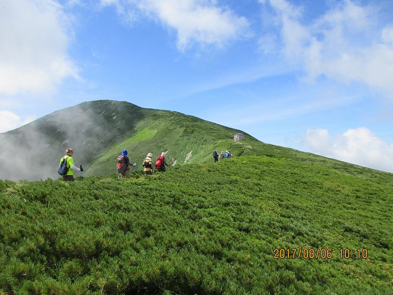 お天気が良いのは嬉しいですが、朝から暑い 今回はブナ峠から出発です。橋のない沢を何回も渡り道に少し迷う やっと登山道に戻りホッとする。なだらかな道を上り湿原に 囲まれ キンコウカ咲く 鳥原小屋に着く 綺麗で宿泊者が少ないのが嬉しいです。次の日の朝 下界は雲海で囲まれていた。今日も素晴らしい天気の中出発する。鳥原山に着く と小朝日岳 大朝日岳 遠くに月山 鳥海と景色が素晴らしい。 熊越に重い荷物を置き ハクサンオミナエシ ハクサンシャジン等咲く道を行き 銀玉水で水を補給しマツムシソウ ニッコウキスゲ ウサギギク ミヤマクルマバナを愛でながら大朝日小屋に着く。 小屋の周りにもハクサンフウロ クルマユリ タカネナデシコ等が咲いている。山頂で昼食にして下山する。熊越で荷物を取りやっと駐車場に着くと 運転手さんの甘くて冷えたスイカとジュースの差し入れにびっくり 今年も有難うございます。 |
