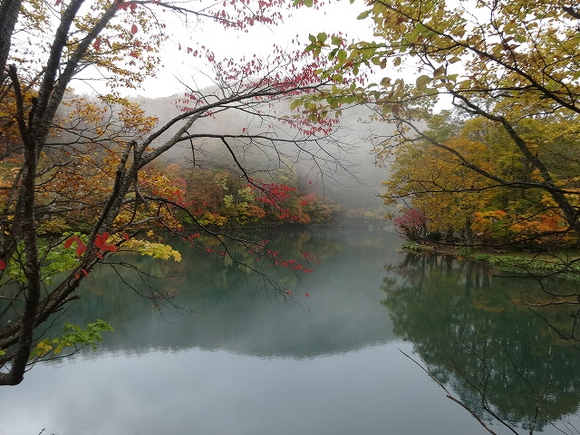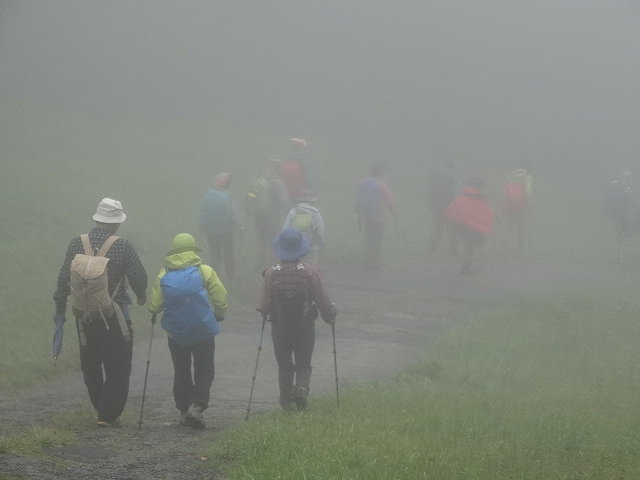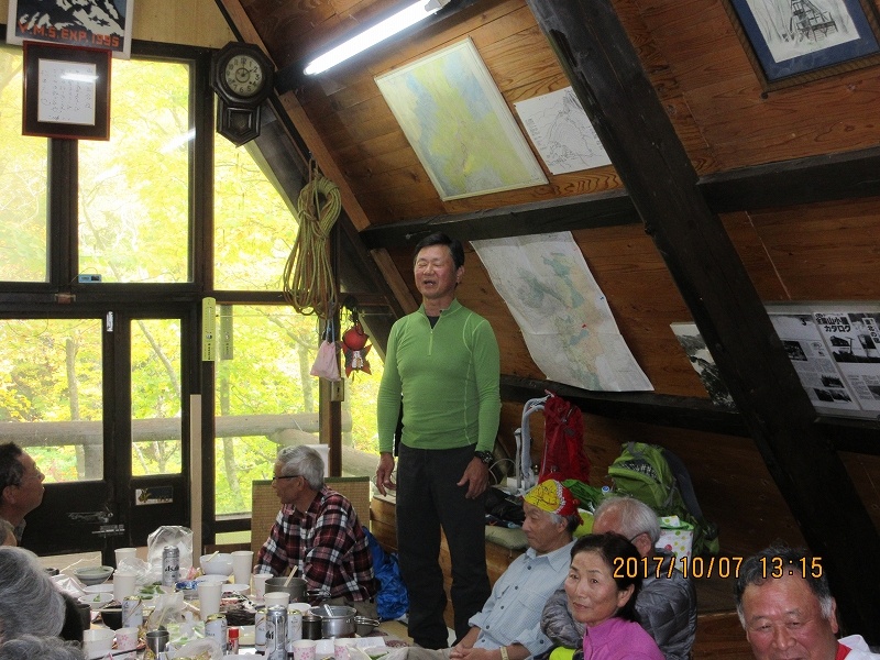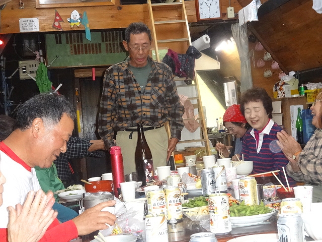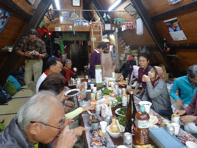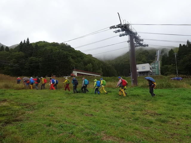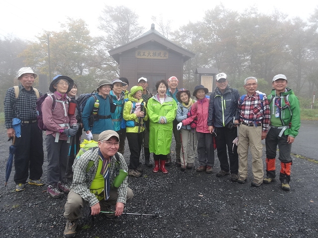 今日は、蔵王での芋煮会。しかしながら、小雨が降っている。蔵王温泉バスターミナルで完璧な雨支度をして待つ。 今回のチーフリーダーの三浦さんより挨拶。霧雨の中を出発するが、すぐに雨が上がり、竜山ゲレンデのリフト乗り場で脱ぎタイムを取る。蔵王のジャンプ台を右手に見ながら、藪をかき分けリフト中間地点位にあるコエド越えコースの入り口を探す。ここから、見通しの効かない樹林帯の中、きつい登りが待っている。ひたすら登ると、やがて明るくなり、宝沢との分岐、コエド越に出る。ここで休憩を取り、右に折れスカイケーブル駅へと向かう。尾根道は、展望もあり、霧の下に温泉街なども見ることが出来た。紅葉が美しい低木帯を進んで行くと、中央高原に出る。標高1264mのドッコ沼周辺では、カエデなどの葉が赤く、ブナなどは黄色に変わり、紅葉の見頃を迎えていた。役員の声に迎えられ、山小屋に到着する。早々に乾杯をして、女性役員が作ってくれた美味しい芋煮を頂く。芋は、ねっとりとして柔らかく、牛肉も美味しい。会員が差し入れてくれた枝豆、わらびの一本漬け、イナゴの佃煮、寒天のデザート、ミョウガの酢漬け、色々な漬物などすごく料理が並ぶ。皆で歌ったりして、楽しいひと時を過ごす。帰りの蔵王権現堂では、吉村県知事と一緒に写真を撮り、ガスの中、バスターミナルに無事に着く。 |
