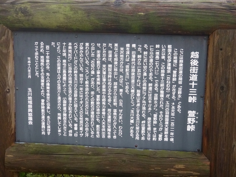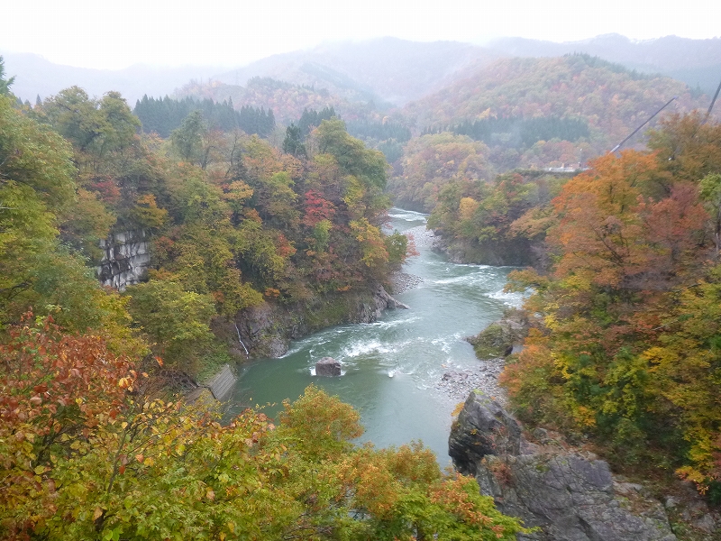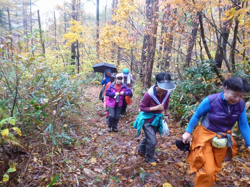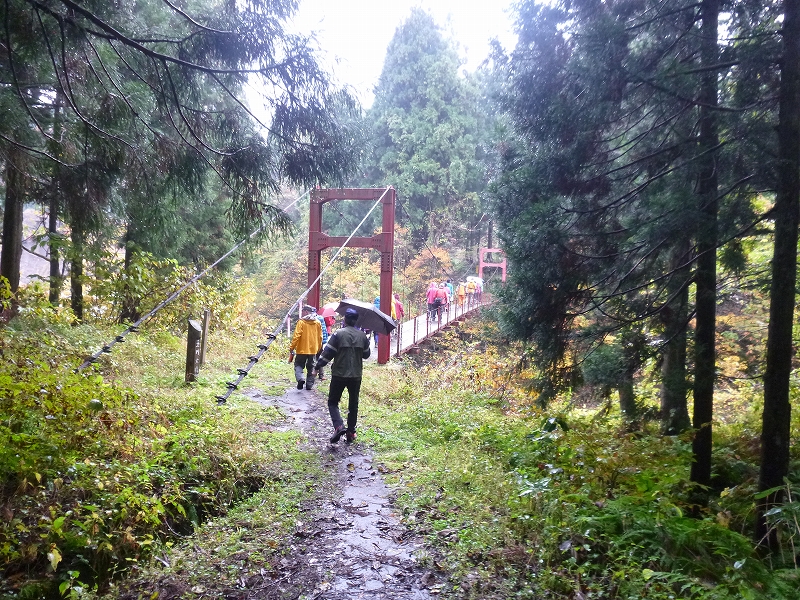 山形百名山である大境山を目指し一路小国町へ。大境山登山道入口に到着すると天候は雨、山にはガスがかかっている。岩田副会長から本日の予定を変更し、越後十三峠の萱野峠(標高278m)と黒沢峠(標高426m)を縦走する旨の説明があった。 敷石道萱野峠玉川から出発、3.2km約80分の行程だ。小雨に煙る中、周辺の景色はブナの黄色やカエデの赤など紅葉真っ盛りである。峠道はぬかるみ、敷石は苔むして滑りやすい。文献によると十三峠は、かつて越後と置賜の物資運搬等のため石を切り出し整備したものとある。明治11年英国の女性旅行家イザベラ・バードがこの峠を玉川から足野水に越えていると記してある。驚くべきは、この敷石道整備の偉業を後世に残すため、地域の人たちが復興に尽力してきたことだ。 時おり雨も止み陽ざしが見え隠れする。次の峠行のためバスで黒沢に向かう。黒沢峠敷石道の出発地点にイベント会場である祭り広場に到着、依然として雨は止まない。大きなテントや炉端がある一角で昼食とする。雨を避け休憩するには格好の場所だ。 さて、後半の峠縦走路である黒沢峠敷石道を出発、2.6km約65分の行程だ。その内、約1.8kmに3,600段の敷石が敷かれているという。この街道を通った著名人として、直江兼続、五郎八姫、西郷隆盛等が知られている。峠道の途中、数カ所の沢にパイプの橋が架けられているが、雪を前に敷板が外されており渡り歩くのに工夫を要する。ようやく峠を越え市野々の駐車場に着く。 帰路途中、横川ダム建設のため白い森おぐに湖に沈む予定の飛泉寺から移設され、見事に色付いた大イチョウを見学。さらに、南陽市小岩沢と上山市川口の石造り眼鏡橋を見て、当時の土木技術の高さに感心した。 奇しくも本日、東北中央道福島~米沢間が供用開始され、国道13号上りがやけに混んでいる。朝から二つの峠を縦走し、今では珍しい石橋も見学した。まさに「温故知新」で先人の苦労に思いを巡らし、「道」造りの大切さと歴史を学んだ道行であった。(秀) |