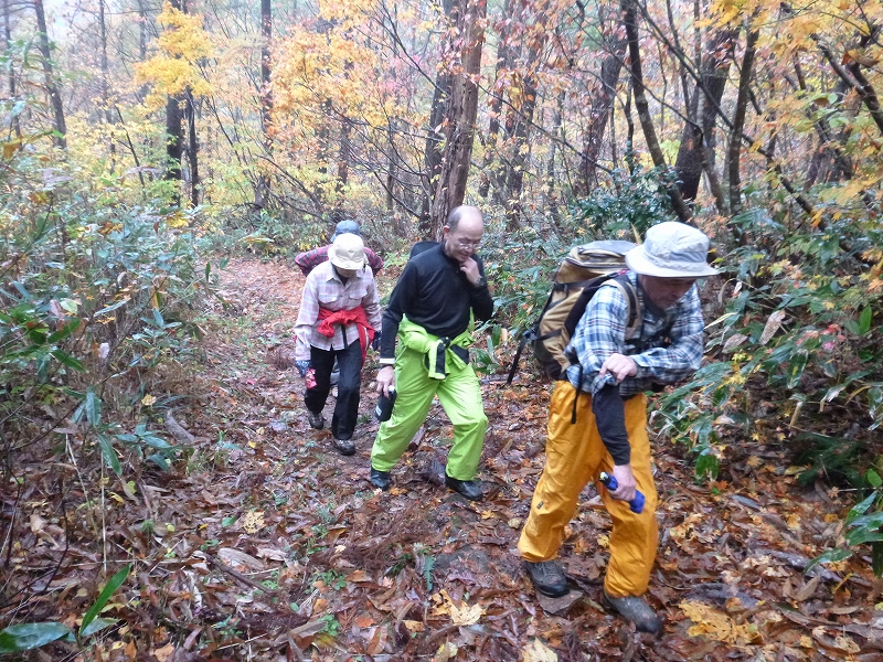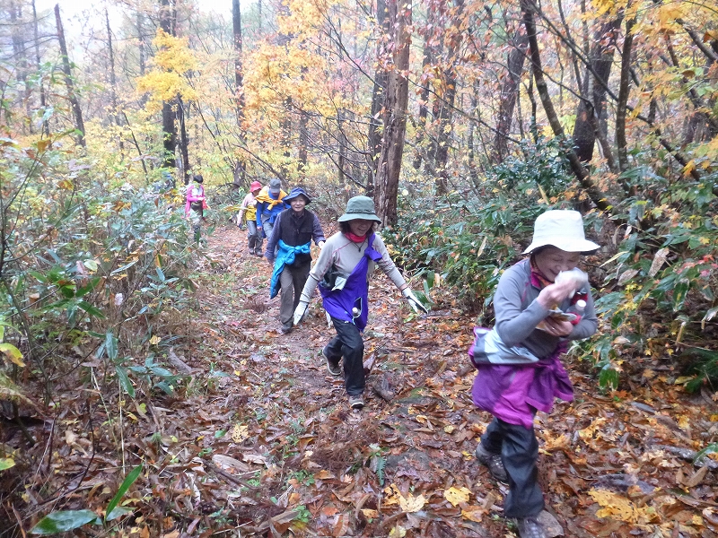 | 11月4日 | 県庁6:10==国道13・113号==小国町ぶな茶屋==8:08大境山登山口8:19==萱野峠玉川8:37~~萱野峠足野水10:20==11:08黒沢峠祭り広場(昼食)11:45~~黒沢峠市野々口12:48==イチョウ広場==飯豊道の駅13:45==小岩沢==川口==県庁15:34 |