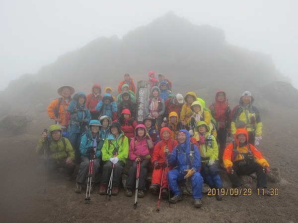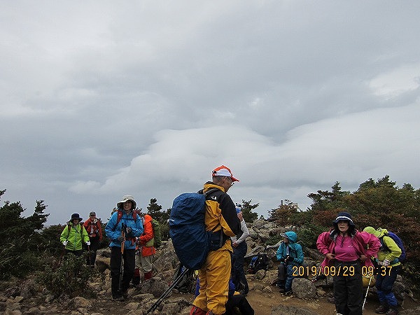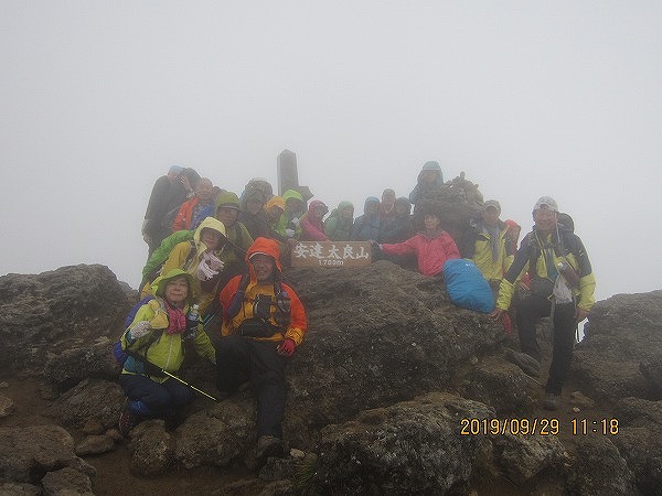 4953 山頂での記念撮影、この後、強風と小雨でカメラに水滴がかかり、ボケてしまう。そんなことで全員が写ってない。
