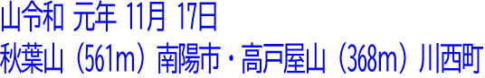 | 晩秋を迎え、やまがた百名山2座の里山歩きです。高戸屋山は、川西町で一番高い山でマウンテンバイク大会のコースになっています。川西ダリア園付近の登山口から西回り、東回りと周回します。山頂から朝日、蔵王、吾妻などの山々が望めます。秋葉山は、通称一の山から三の山まで三つのコブがあると言われ、鳥居もあるそうです。向山公園付近の秋葉山登山口からピストンの山歩き、山頂から飯豊連峰が望めます。いずれも初級コースですが、転倒事故のないよう十分注意しましょう。 |