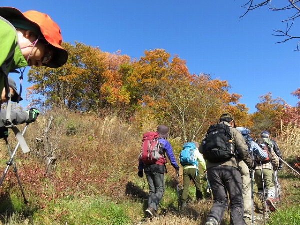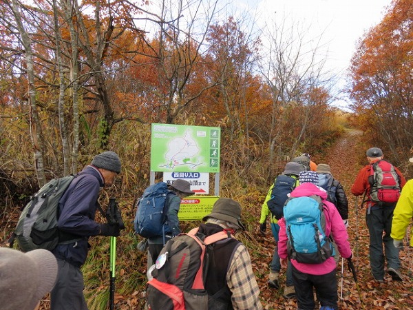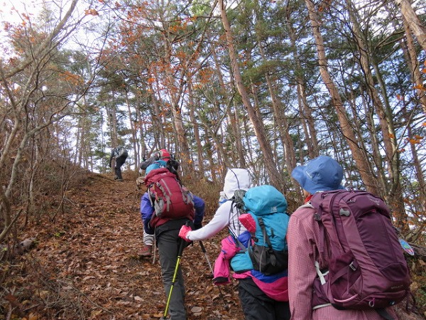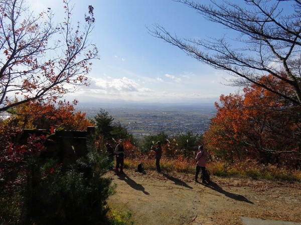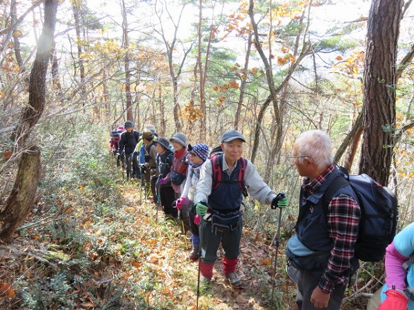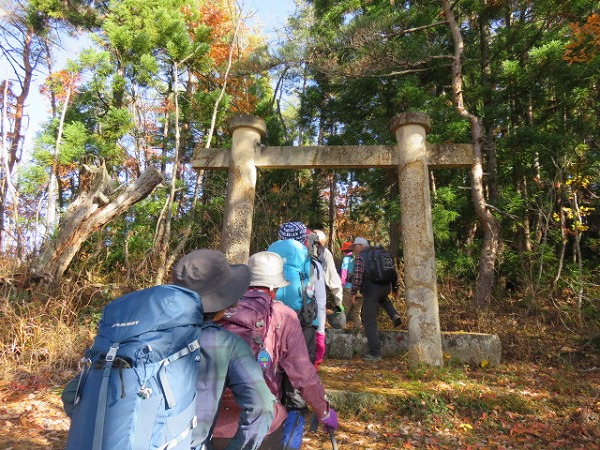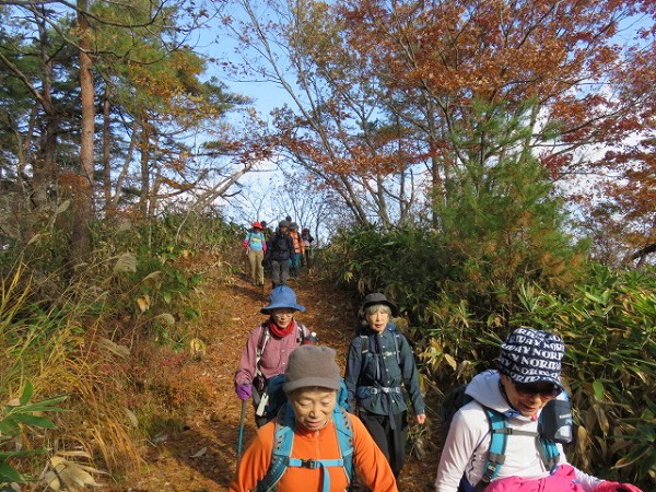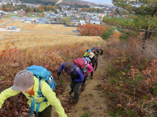 山形百名山の里山 高戸屋山・秋葉山の二座を目指す。晴天の予報が、明け方には小雨がパラつき、天候の成り行きが懸念されたが、出発のころには雨も上がって、登山日和の予感。バスの向かう先には飯豊の山々が雪をまとって輝いている。川西町の中心部に位置し、町の眺望がきく山ということで期待が膨らむ。スキー場の脇を通って山に入っていく。緩やかな尾根道で、マウンテンバイク大会のコースとしても利用されているというだけあって、道幅があり歩きやすい。小さなアップ・ダウンを繰り返し、展望の良いところでは小休止をとってふもとのダリヤ園や晩秋の置賜盆地の景色を堪能。登山道脇にはクリタケ・なめこなどのキノコが顔を出す。所々に熊の落とし物があり、獣の臭いが漂ってくる。季節外れのイワカガミの花が一輪咲いていた。ミズナラなどの黄葉が光を受けて輝く。山頂まで500mの看板から急登を登りきり、山頂着。置賜盆地の向こうには白く輝く蔵王連峰の姿が、北側には雪の大朝日岳の雄姿が望める。しかし、日頃見なれている蔵王とは異なり、初めはなかなか蔵王とは特定できなかった。山は見る角度によって違う表情を見せる。蔵王の雄大な稜線を望むことができるこの山は絶好の展望台であった。 下りもアップ・ダウンを繰り返す。粘土質の急な下りは前日の雨でぬかるんで滑りやすく注意が必要。 予定よりも早く下山し、東回り登山口の鏡池のほとりで昼食休憩。池の対面の所は原田甲斐の祖父の代まで居城していた城跡で、原田城址(藤ケ森城)とAさんから伺った。大河ドラマになった「樅木は残った」で有名な樅の古木がそびえているとのことである。 二座目の秋葉山へ向かう。途中、小松駅で休憩。町民管理の駅で、まちなか活性化のため、駅を中心に様々な取り組みをしているとのことで、町民が集えるようなスペースがあり、俳句などが掲示されていた。 秋葉山登山口着。果樹園の中を通る道。真っ赤なリンゴがたわわに実をつけている。おいしそう!紅葉が日差しを受けてまぶしい。快適な登山道を進む。一の山(389m)の鳥居は上部が破損し、笠木・神額が下に落ちている。二の山(477m)と進むと、秋葉山荘がある。地元の山岳会のメンバーが集うところらしい。ここからは南陽市宮内地区の街並みを見渡すことができた。飯豊の山並みも見えるはずだが、雲がかかっていて、はっきりとは見えない。ここから山頂まではいったん下ってまた登り返しの一登り、山頂からは眺望がきかない。下山途中の木々の間から、雪をまとった大朝日岳が望めた。向山公園に下山、帰路につく。途中、観光客で賑わう熊野大社で小休止。大イチョウが太陽の日差しを受け、きらきらと輝いていた。帰路途中のバスの中から蔵王の雄大な姿を望み、最高の眺めと歓声が漏れた。晩秋の陽だまりハイクの感じで楽しい山行であった。 |