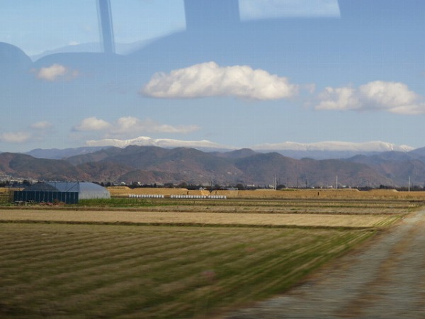 宮内に向かう車窓から 真っ白な雪を被った蔵王連峰