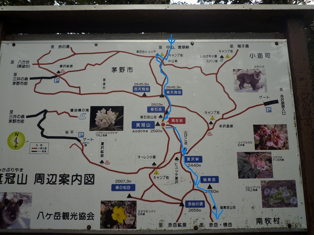 年に指定された「八ヶ岳中信高原国 定公園」の一部を占め、南北およそ 30km、東西 15km におよぶ山岳高原地帯で、その主峰は標高 2899m の赤岳である。山名の由来については諸説があるが、多くの峰々の連なりと理解し、八峰を 特定することは避けた方がよさそうだ。 南北に長く連なる八ヶ岳連峰は、山容や地域の特性などから、一般に夏沢峠以南を「八ヶ岳」 あるいは「南八ヶ岳」、以北を「北八ヶ岳」と呼んでいる。 連峰の生成は、本州中央部を南北に走っているフォッサマグナ(中央構造線)に沿って連続的 に噴出した火山が合体したものである、最初に噴出したのはおよそ 300 万年前とされている。 北八ヶ岳の山々は、山頂部は比較的なだらかな峰が多く溶岩流や溶岩円頂丘などをよく残してお り、山麓部はひだ状に開析された火山麓が広がる。樹林帯が山稜近くまで続き湖沼も点在する。 一方、南八ヶ岳の山々は、山頂部は侵食作用によって切り立った峰が連なり、山麓部には巨大な 扇状地が取り囲んでいる。南八ヶ岳には急峻な地形を利用した日本有数のロッククライミングの 岩場があり、また冬場は氷瀑のアイスクライミングでも知られる岩稜が中心となっている。 今回の登山コースは主稜線を北から南へ縦走。北八ヶ岳の苔で有名な白駒池をスタートし黒百合 ヒュッテに宿泊、北南八ヶ岳の境目の夏沢峠を経由して南八ヶ岳へ、最高峰赤岳にある頂上山荘に宿泊、 翌日に地蔵ノ頭から地蔵尾根を下り行者小屋へ、そして美濃戸登山口に下ります。 |